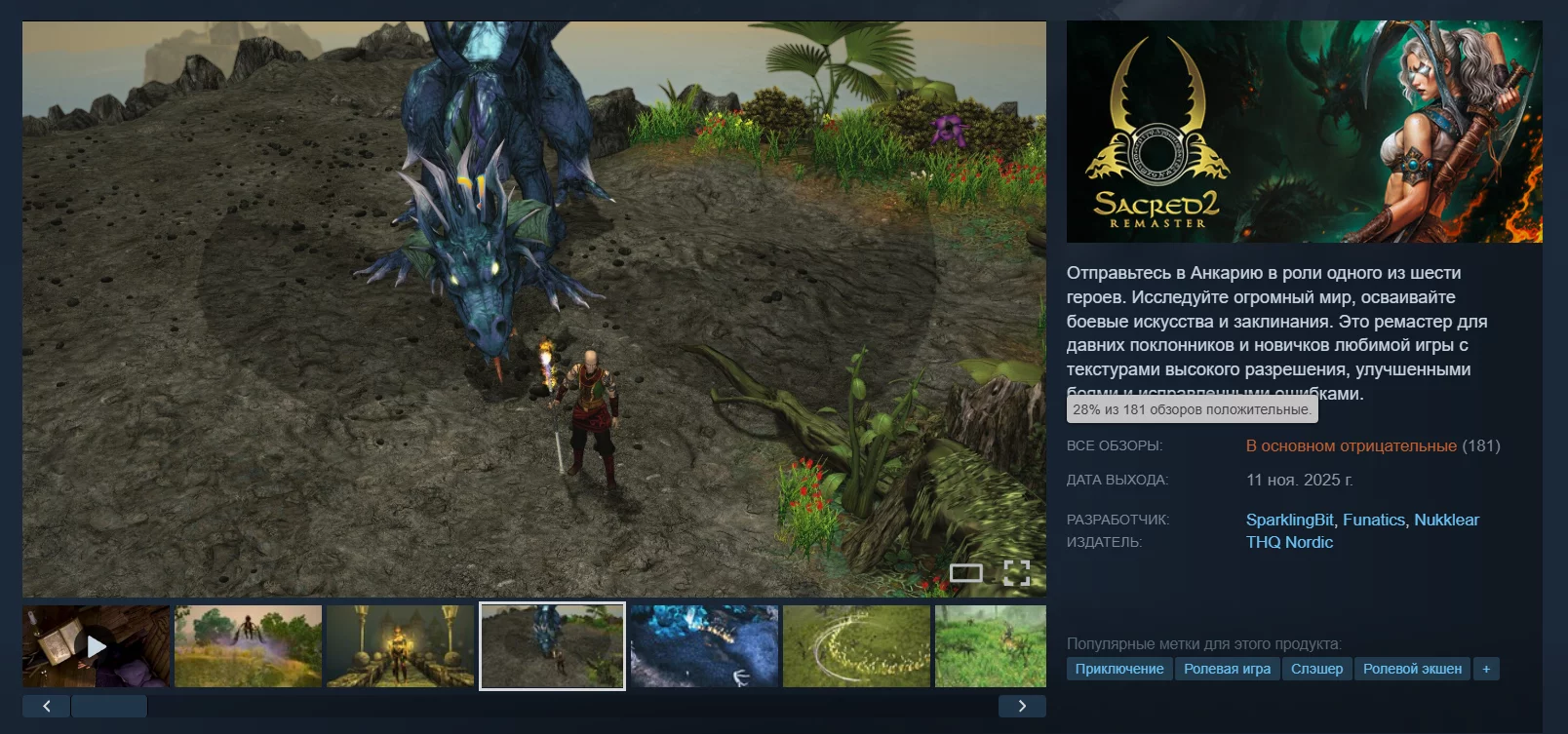 Сегодня (11 ноября) состоялся релиз ремастера Sacred 2, который сразу же начал собирать массу негатива со стороны геймеров. На момент написания новости проект имеет рейтинг 28%.