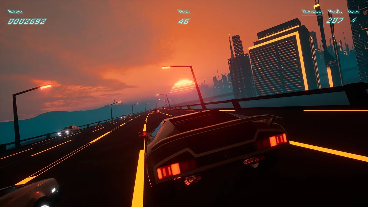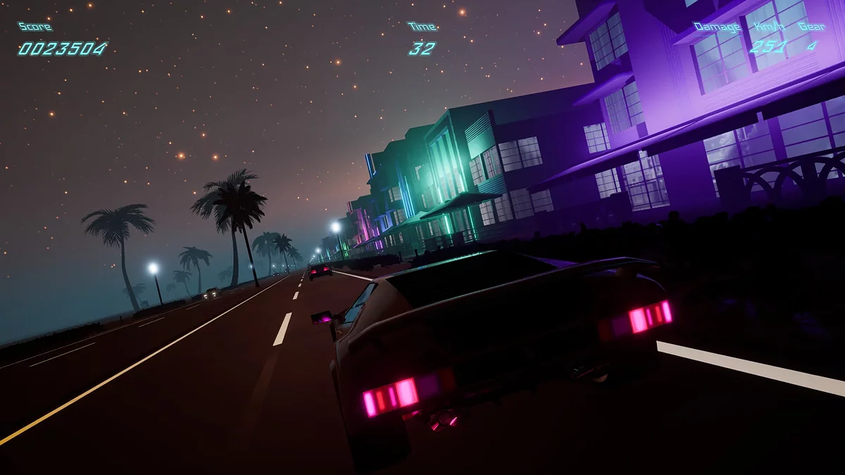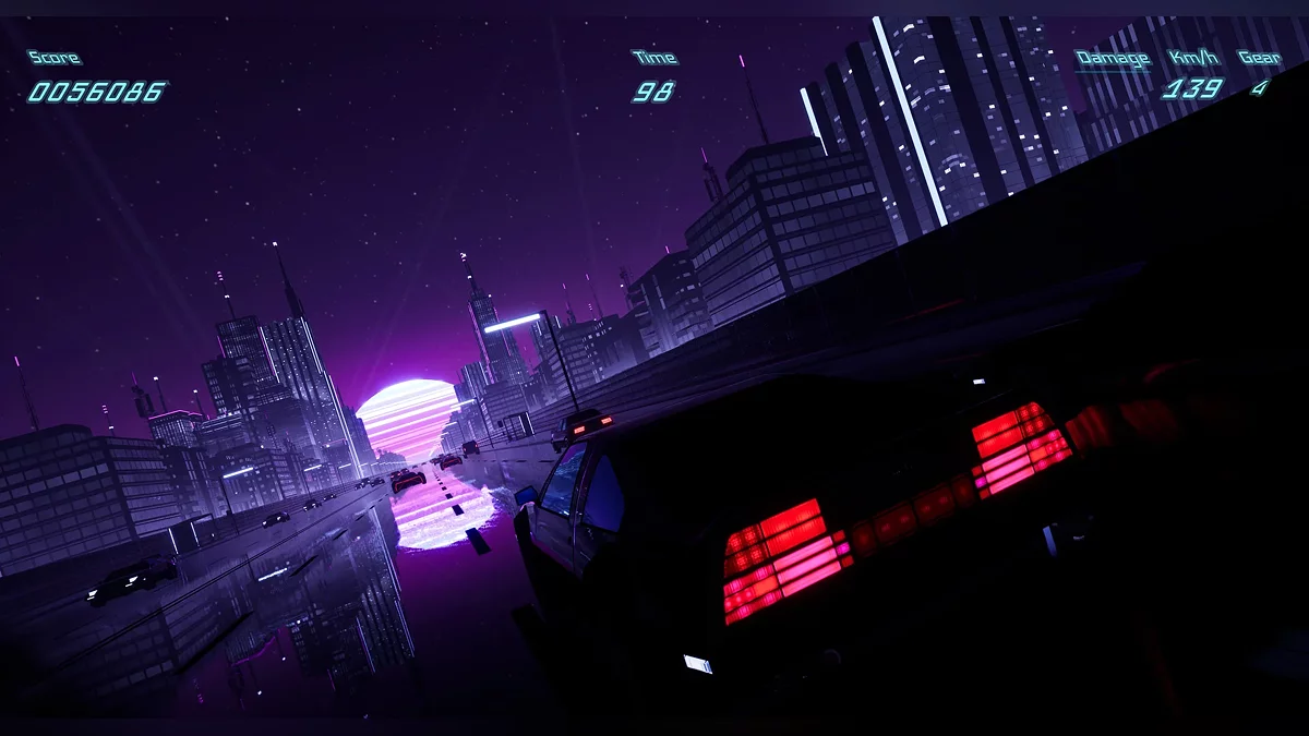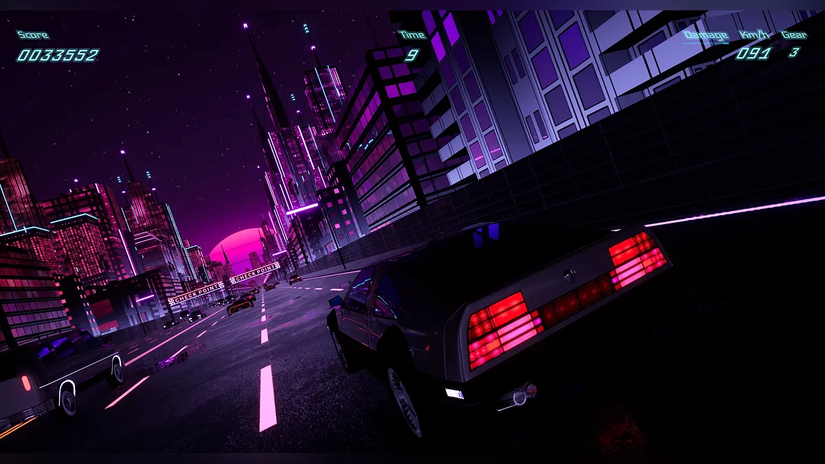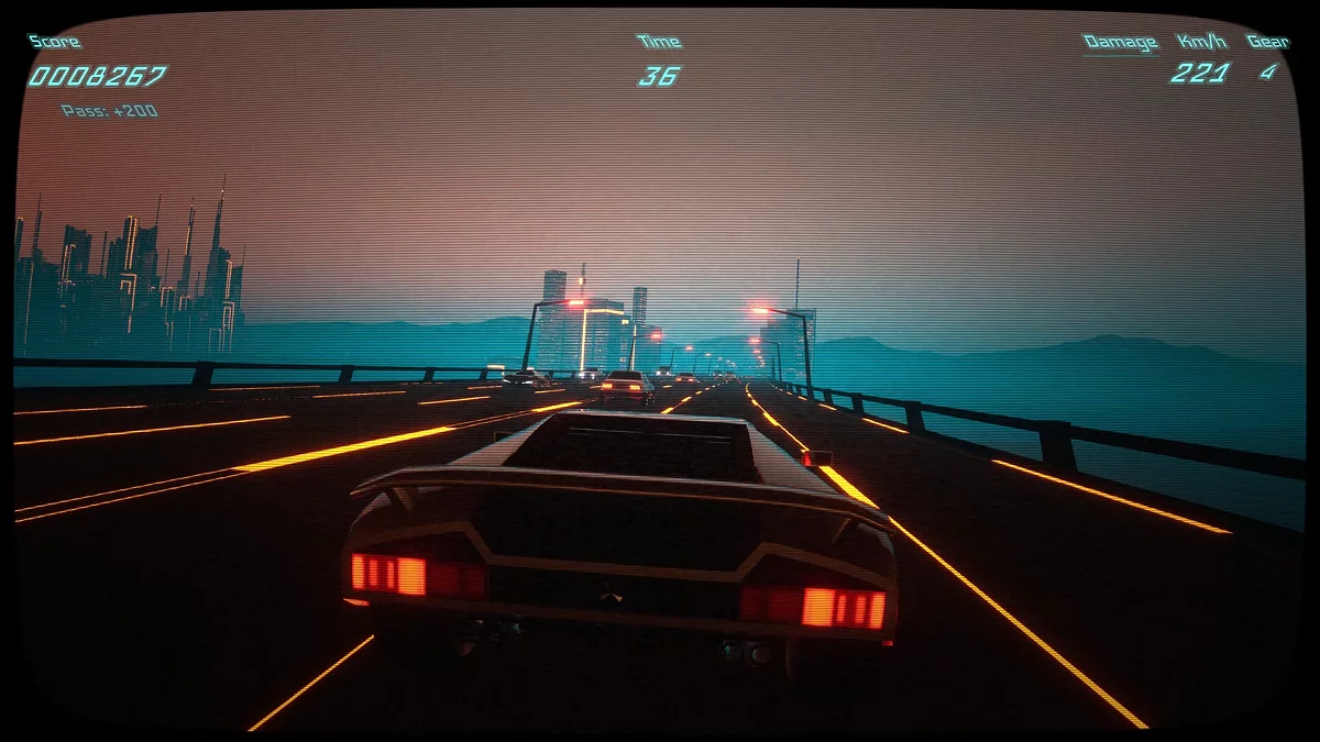 Саундтрек в стиле synthwave и визуальные эффекты, имитирующие CRT-сканлайны, VHS-артефакты и лёгкий киноплёночный шум, создают атмосферу ретрофутуристической аркады. Геймплей ориентирован на простое и расслабляющее вождение, но режим Rush Hour добавляет плотный трафик и ограничения по времени для проверки реакций игрока.