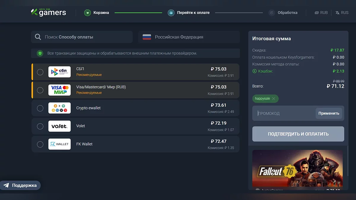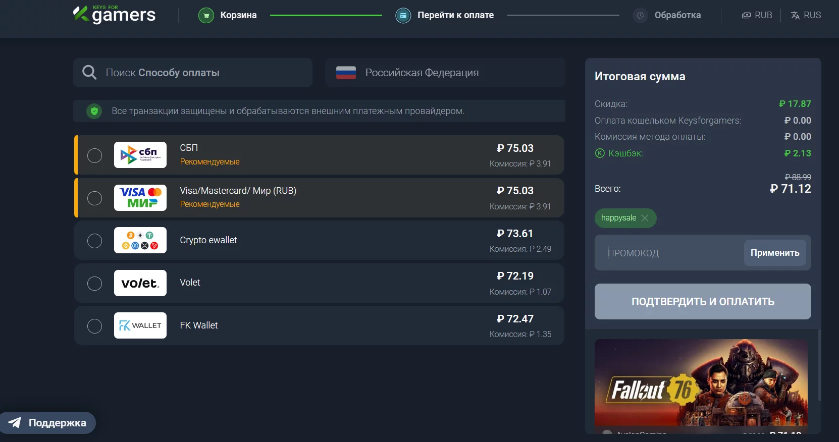 За каждое приобретение пользователи получают вознаграждение до 10% от потраченной суммы. Уровень кешбэка зависит от ранга на платформе — чем больше покупок и активности, тем он выше.