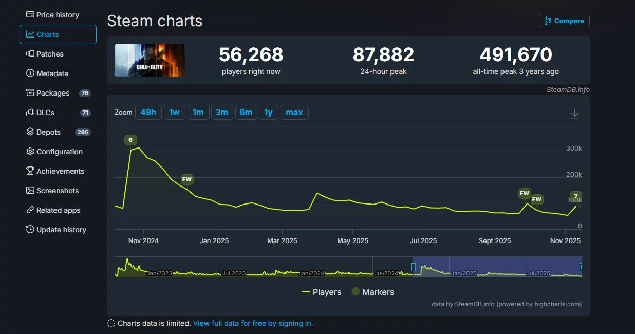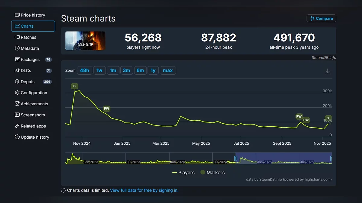 По данным SteamDB, в день релиза Black Ops 7 смогла собрать лишь около 84 тысяч одновременных игроков в Steam. Для сравнения — в октябре 2024 года Black Ops 6 показывала пиковый онлайн около 306 тысяч. Таким образом, стартовый онлайн у новой части оказался примерно на 70% ниже, что для Call of Duty — крайне нетипичная ситуация.