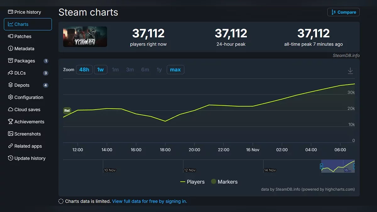 Тем временем ситуация с онлайном понемногу выравнивается. По данным SteamDB, количество единовременных игроков достигло пика в 37 тысяч человек. Данные из лаунчера Battlestate Games не учитываются.
