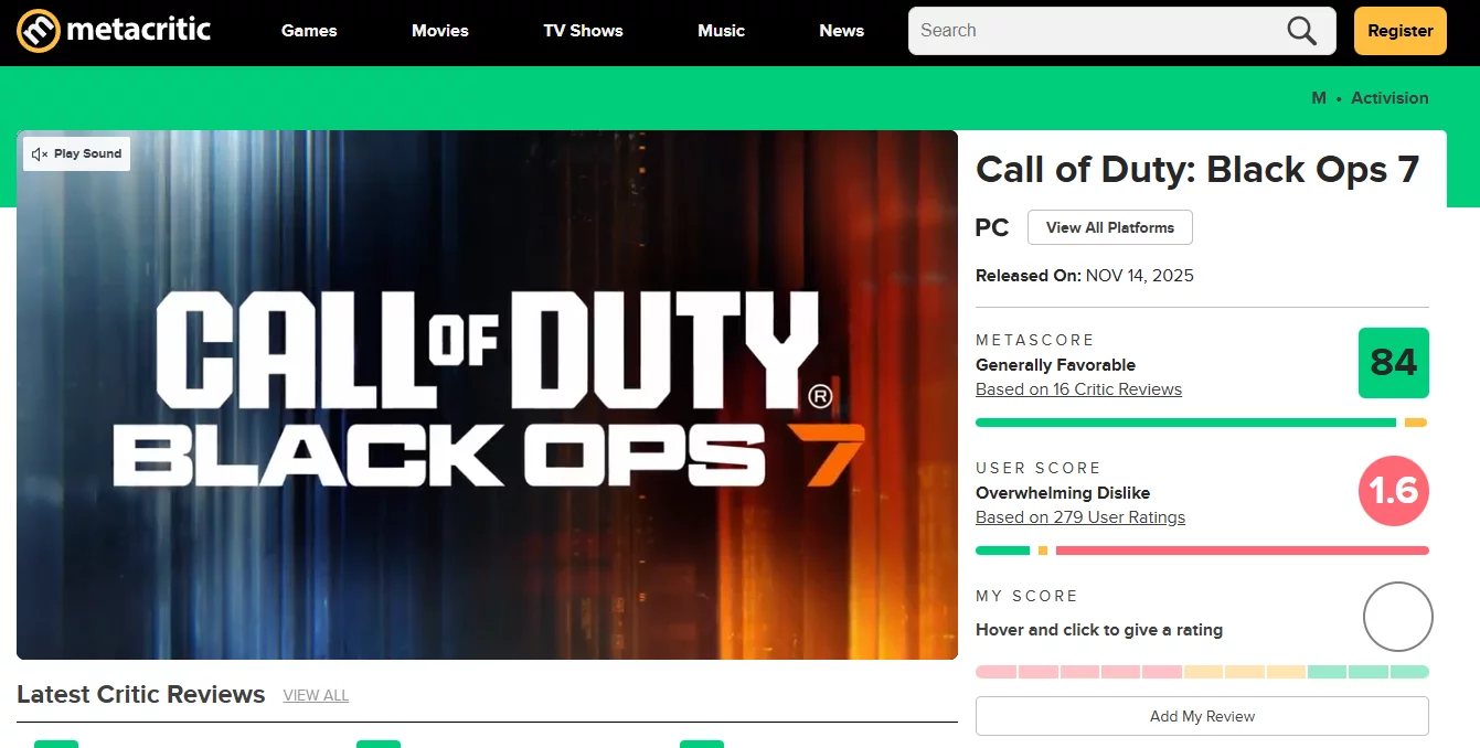 На Metacritic игру уже завалили отрицательными отзывами: на момент написания новости при 279 пользовательских рецензий средняя оценка опустилась до 1.6, что делает Black Ops 7 самой низкооценённой частью Call of Duty за всю историю площадки. Рекорд «антирейтинга» ранее удерживала Modern Warfare 3 с итоговой оценкой 2.3.
