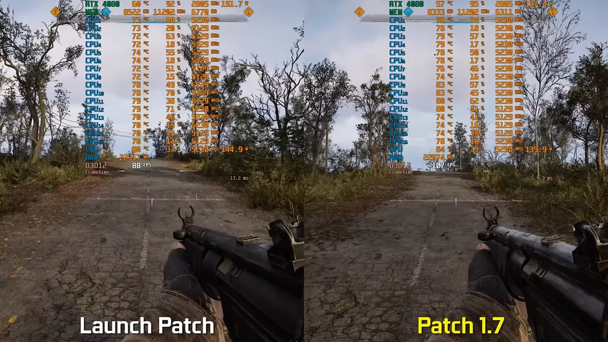 В ролике сравнивают релизную версию S.T.A.L.K.E.R. 2 с обновлением 1.7, вышедшим 17 ноября. Для теста используется компьютер с видеокартой NVIDIA RTX 4080 и процессором Intel Core i7-14700F. Применены эпические настройки графики.