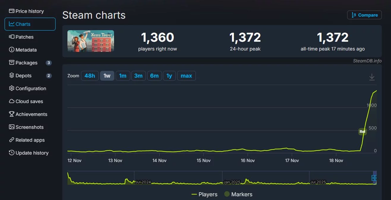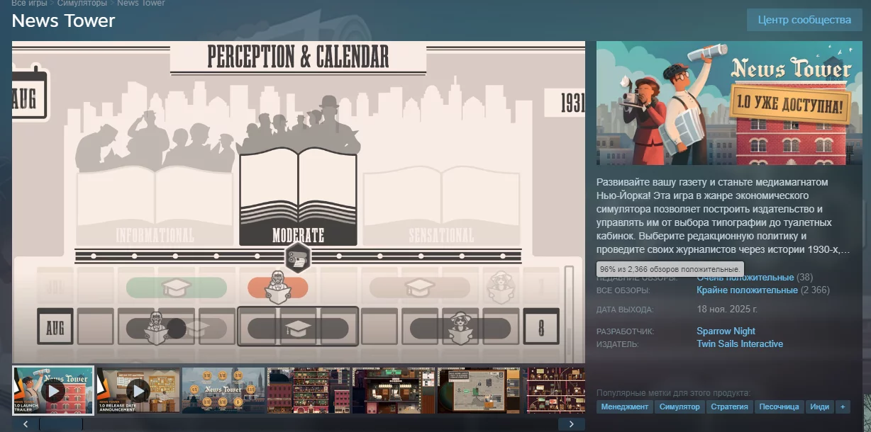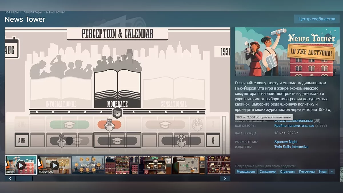 Экономический симулятор News Tower студии Sparrow Night вышел из раннего доступа 18 ноября 2025 года. После релиза игра мгновенно получила волну положительных отзывов от игроков и прессы.