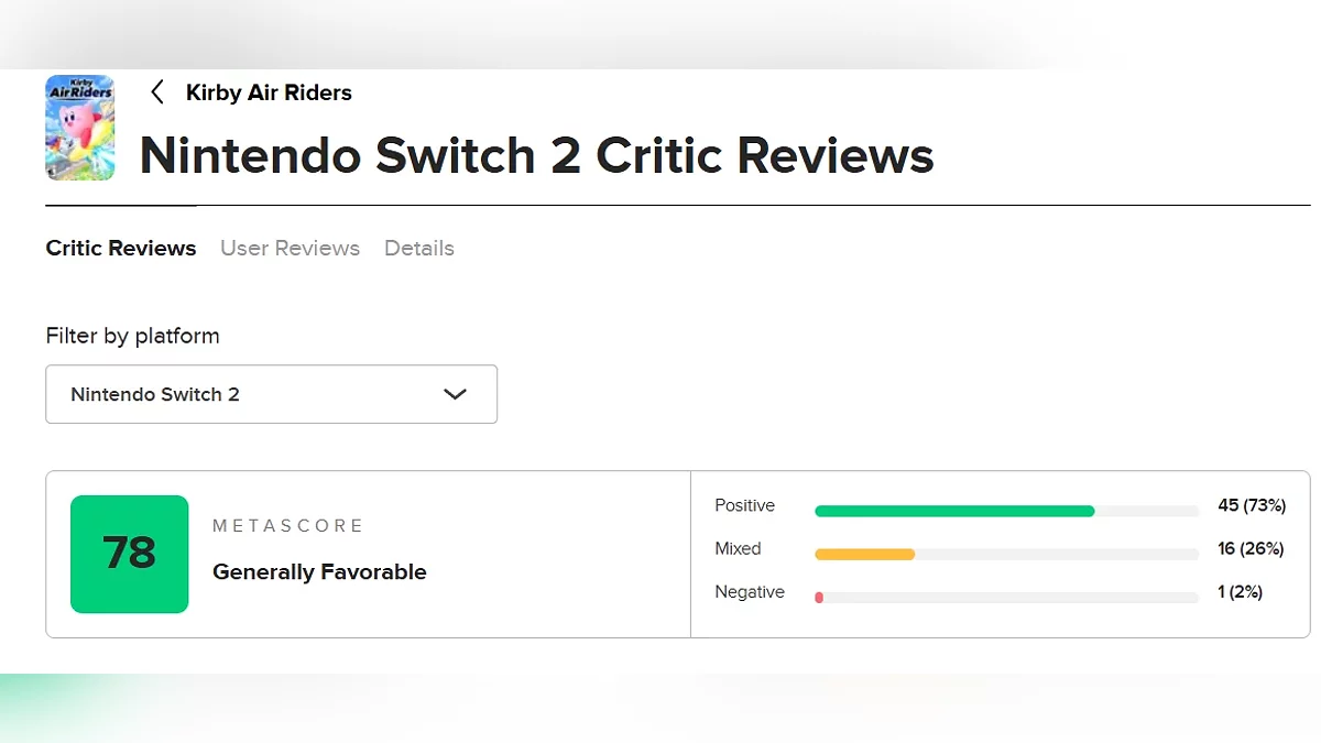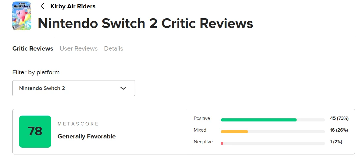До релиза гоночной аркады Kirby Air Riders остаются считанные часы. Впрочем, на Metacritic уже появились первые оценки от критиков. На момент написания новости рейтинг проекта составляет 78 баллов.