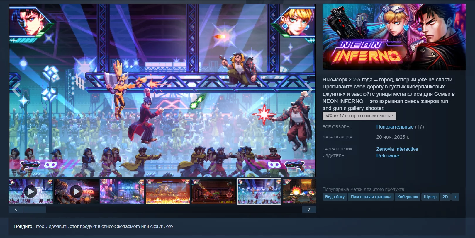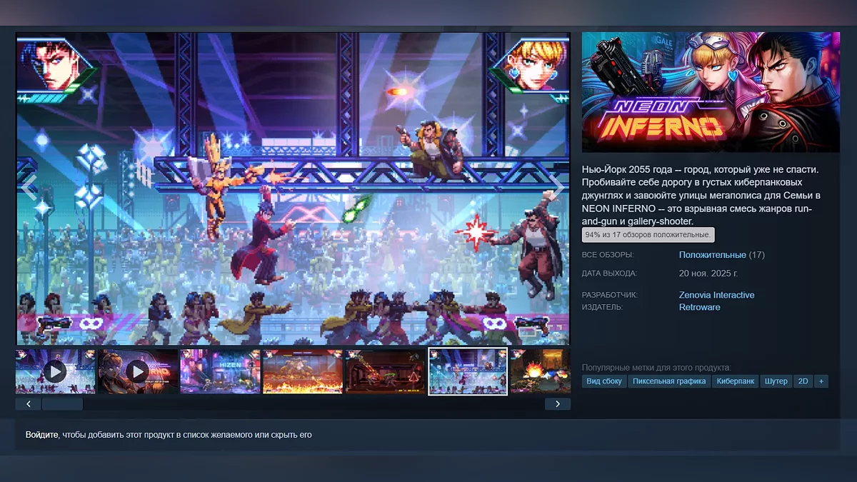 Компания-издатель Retroware и студия-разработчик Zenovia Interactive выпустили в Steam и на консолях (PS4, PS5, Xbox One, Xbox Series X/S и Nintendo Switch) олдскульный киберпанковый экшен Neon Inferno, который уже получил положительные отзывы. Рейтинг на момент написания новости составляет 94%.