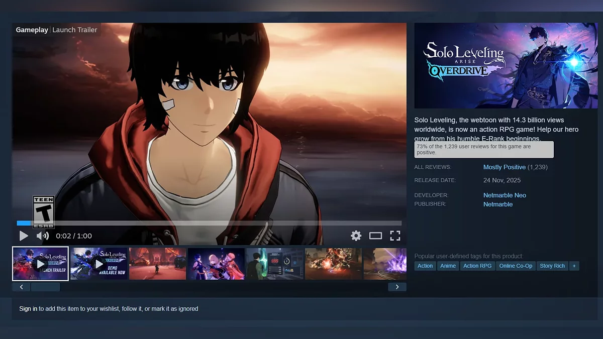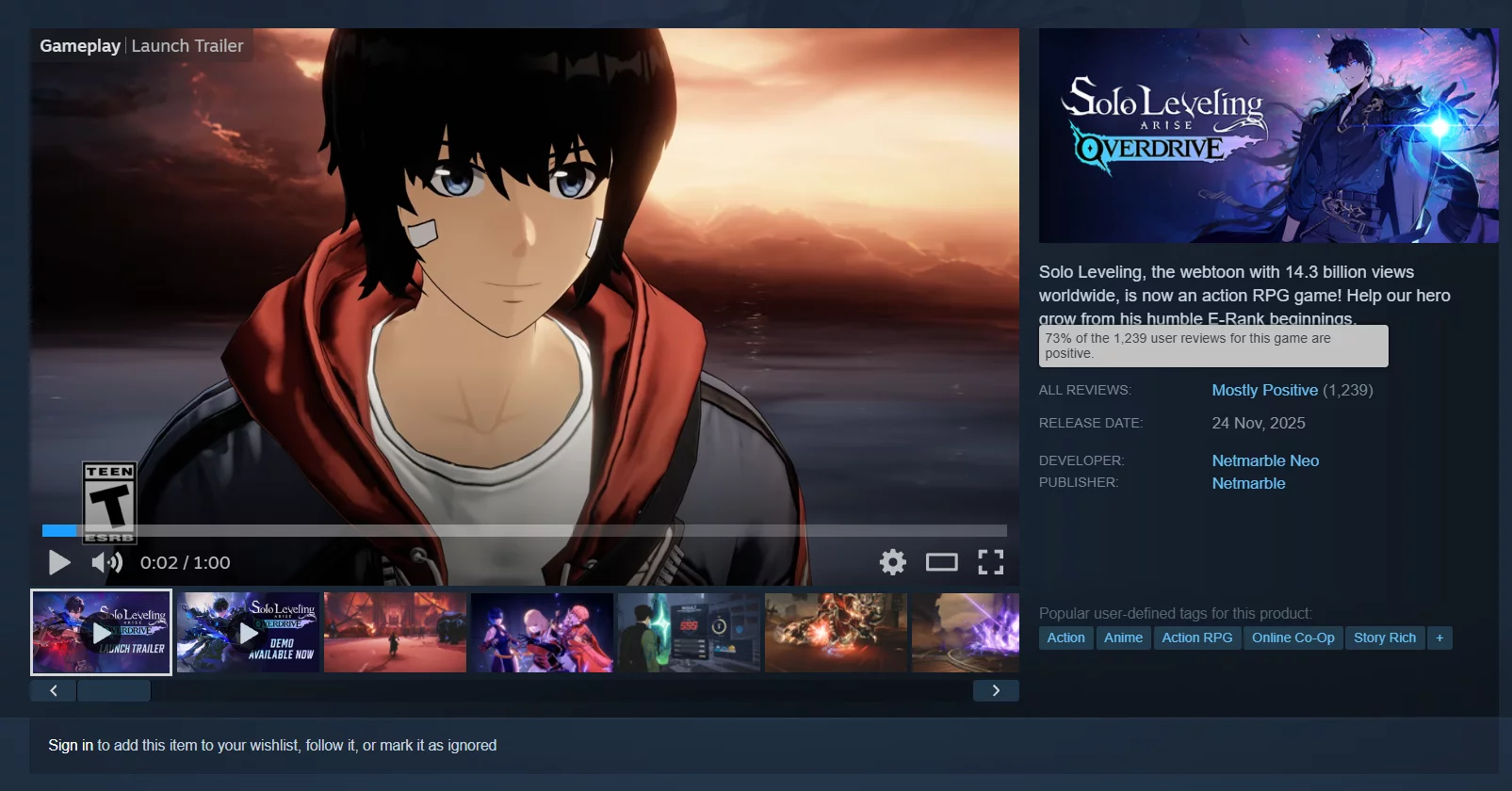 В Steam и Microsoft Store состоялся релиз RPG-экшена Solo Leveling: ARISE OVERDRIVE по мотивам популярного аниме «Поднятие уровня в одиночку». Проект уже получил первую тысячу отзывов. На момент написания новости рейтинг составляет 73%.