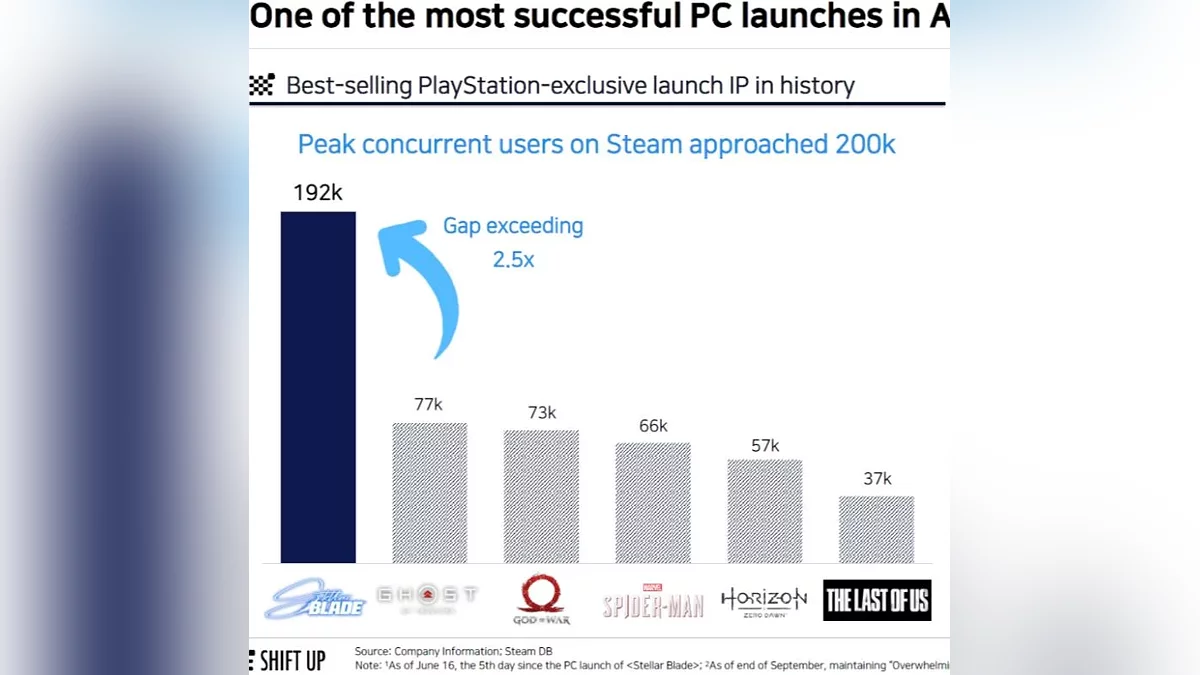 Согласно этим данным, на момент запуска Stellar Blade в Steam, в нее одновременно поиграли 192 000 пользователей. Для сравнения пиковые показатели у Ghost of Tsushima составили около 77 000, а у God of War, Spider-man, Horizon Zero Dawn и The Last of Us — менее 75 000.