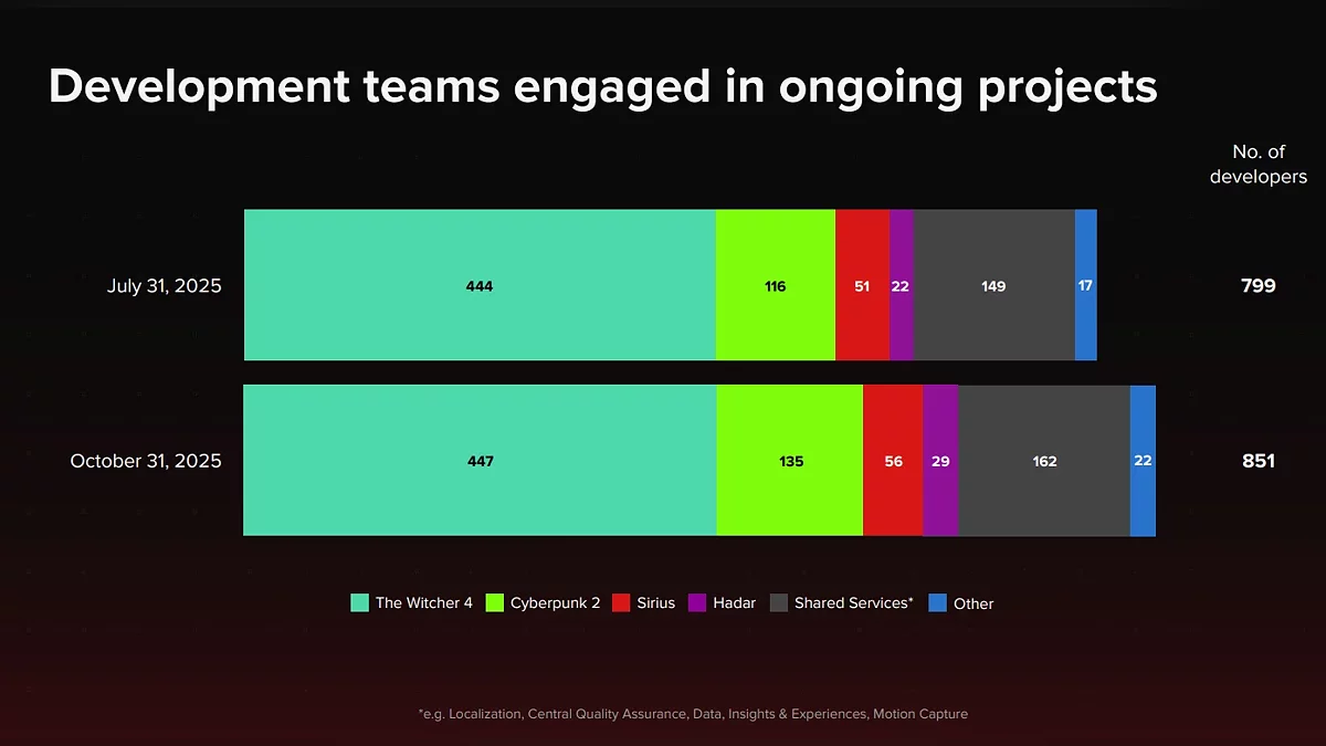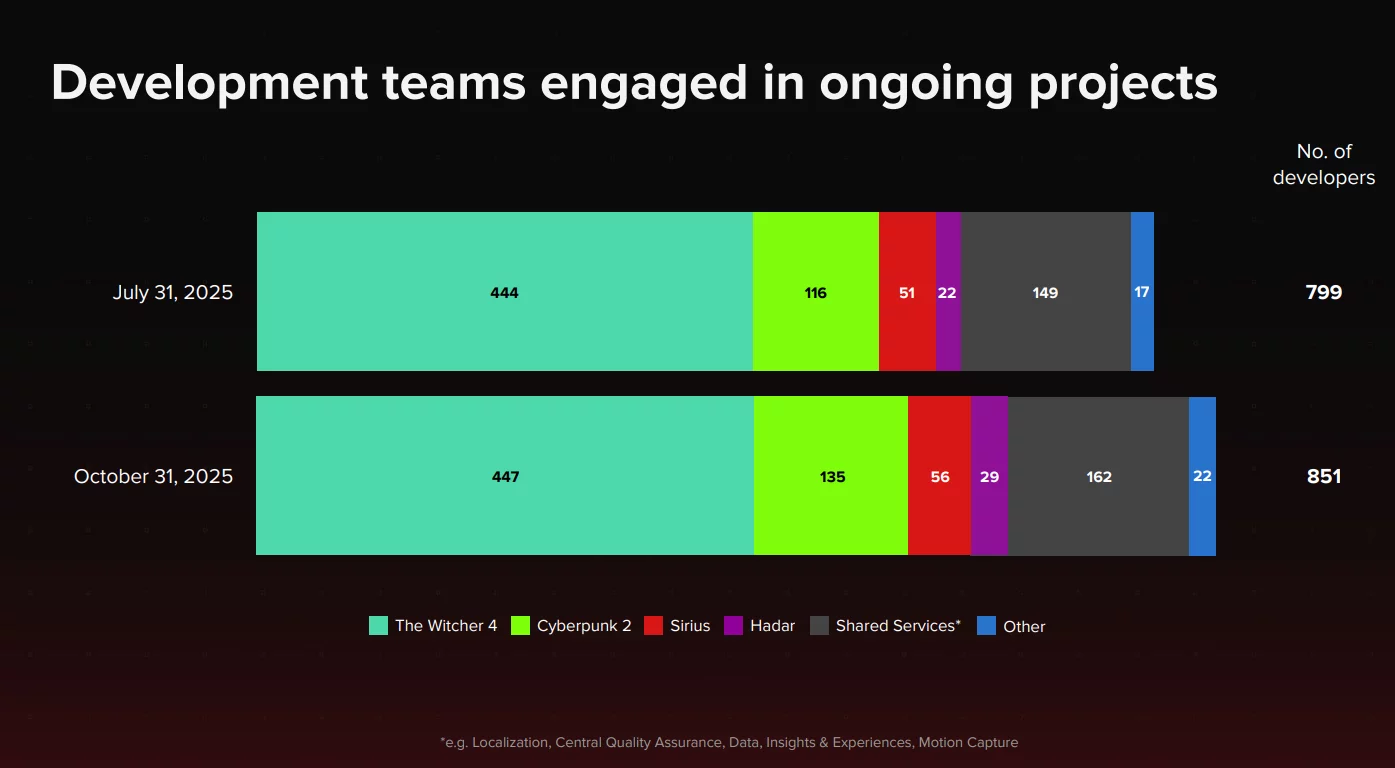 CD Projekt также раскрыла обновлённые данные о распределении сотрудников по ключевым проектам по состоянию на 31 октября 2025 года. Согласно опубликованной инфографике, общая численность разработчиков выросла с 799 до 851 человек за три месяца.