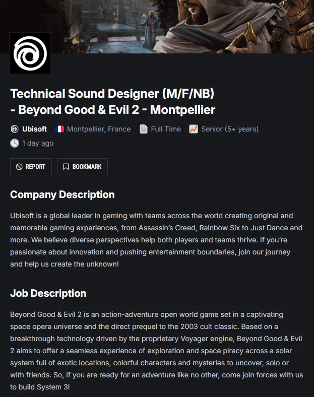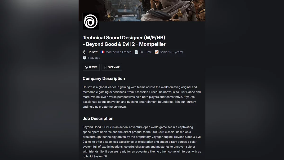 От кандидата требуется более пяти лет профессионального опыта. Работа предполагает создание и курирование звуковых ассетов, а также общее руководство аудиосоставляющей проекта. Должность базируется в Монпелье (Франция) — одном из ключевых центров разработки Ubisoft.