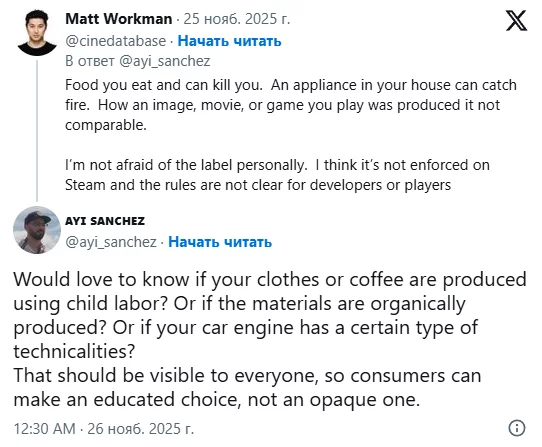 Ранее лоббист ИИ Мэтт Воркман (Matt Workman) призвал цифровые магазины отказаться от специальных отметок, указывающих на использование нейросетей при разработке игр. Суини поддержал эту позицию, заявив, что такие метки «не имеют смысла», поскольку ИИ уже задействован во множестве проектов и в будущем станет нормой. В качестве примера таких «бесполезных» меток глава компании привёл Steam, и ответ Valve не заставил долго себя ждать.