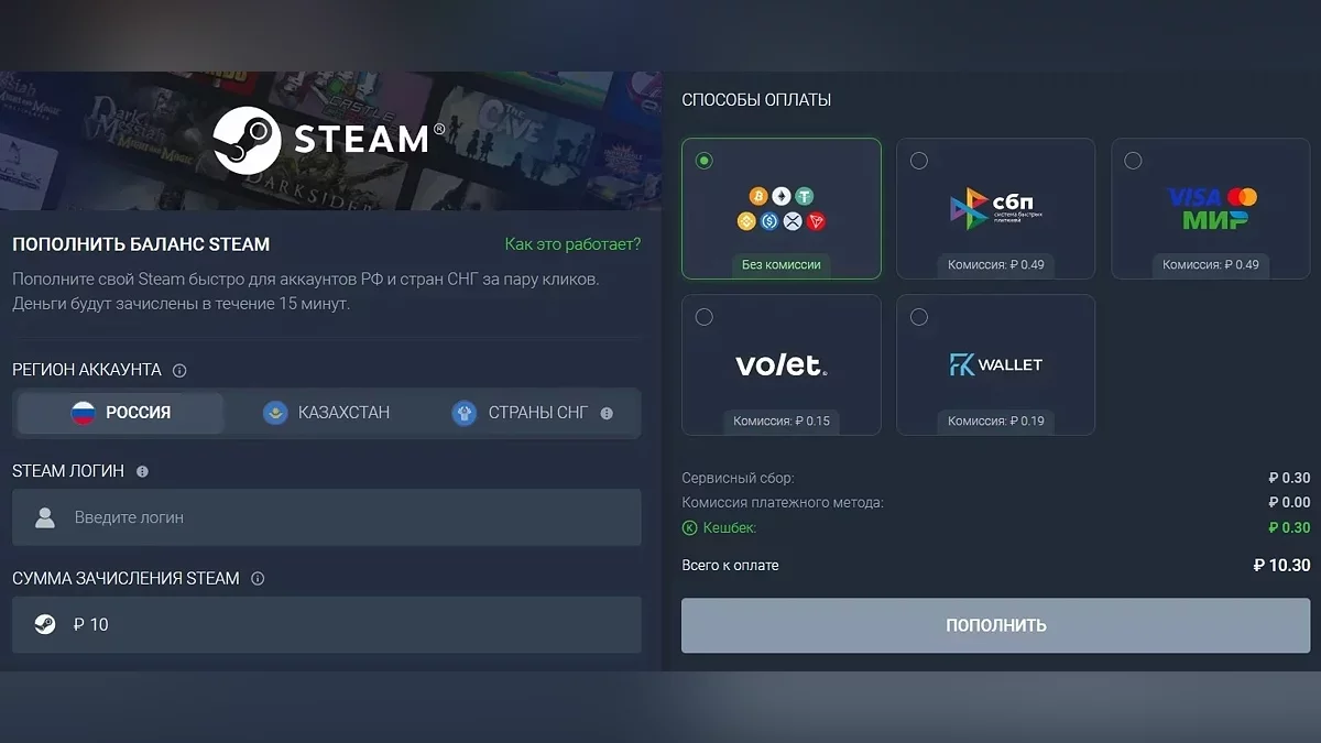 Кроме того, геймеры также могут пополнить баланс Steam (с 3% комиссией сервиса) на любую сумму от 10 руб.