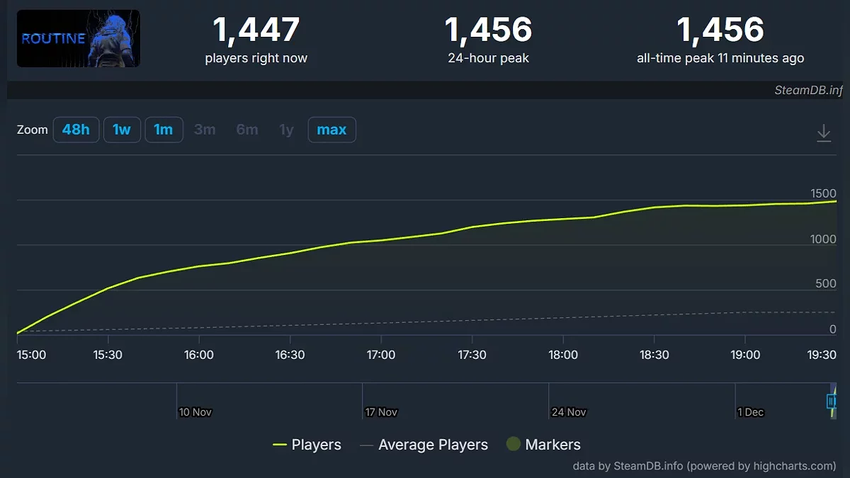 Научно-фантастический хоррор Routine получил первые отзывы в Steam. На момент написания новости рейтинг проекта составляет 90%. Среди плюсов выделяют визуальный стиль в духе футуризма 80-х, атмосферу космического ужаса и качественный звуковой дизайн. Пиковый онлайн в первый день составит 1,4 тыс.