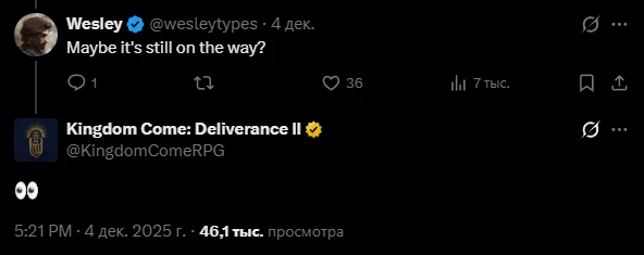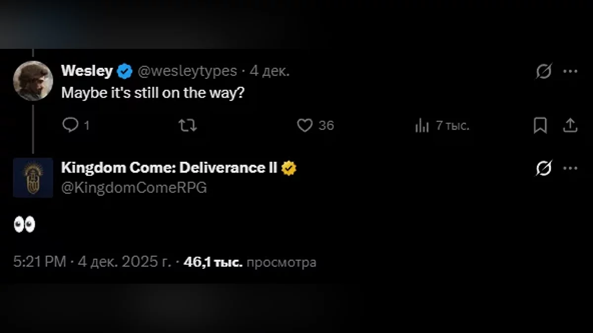 Теперь же сама Warhorse Studios оставила намёк на возможный релиз. Пользователь с ником wesleytypes поинтересовался, не находится ли патч «в пути», на что официальный аккаунт разработчиков KCD отреагировал настороженным смайликом.