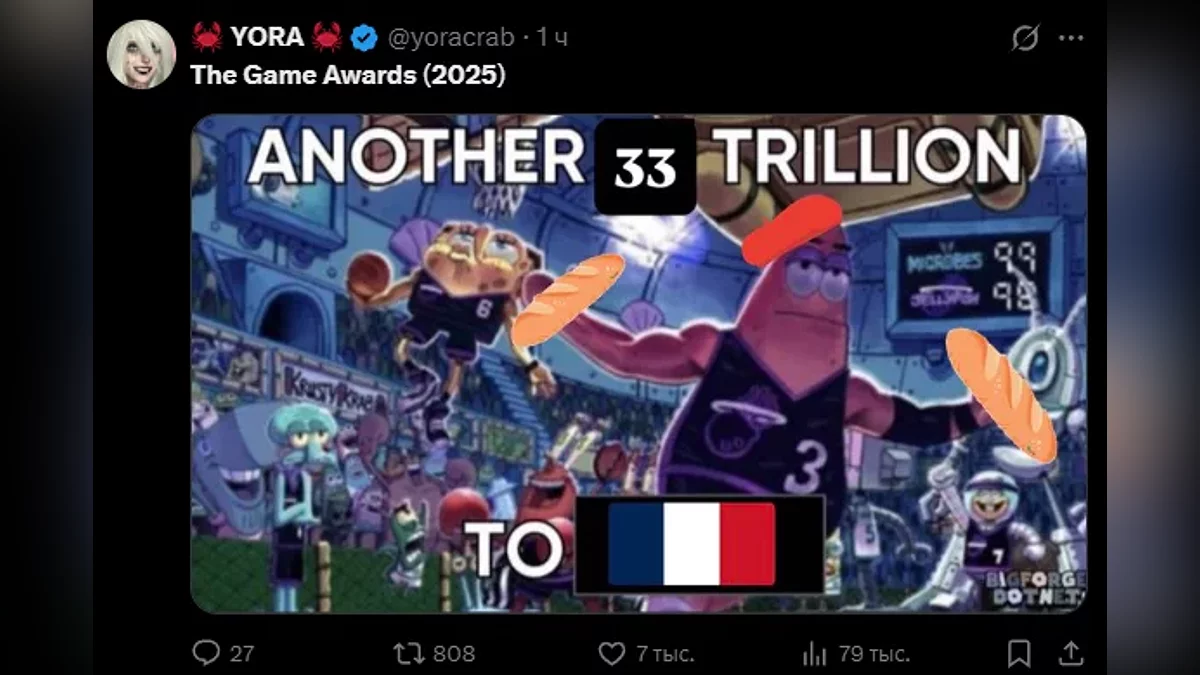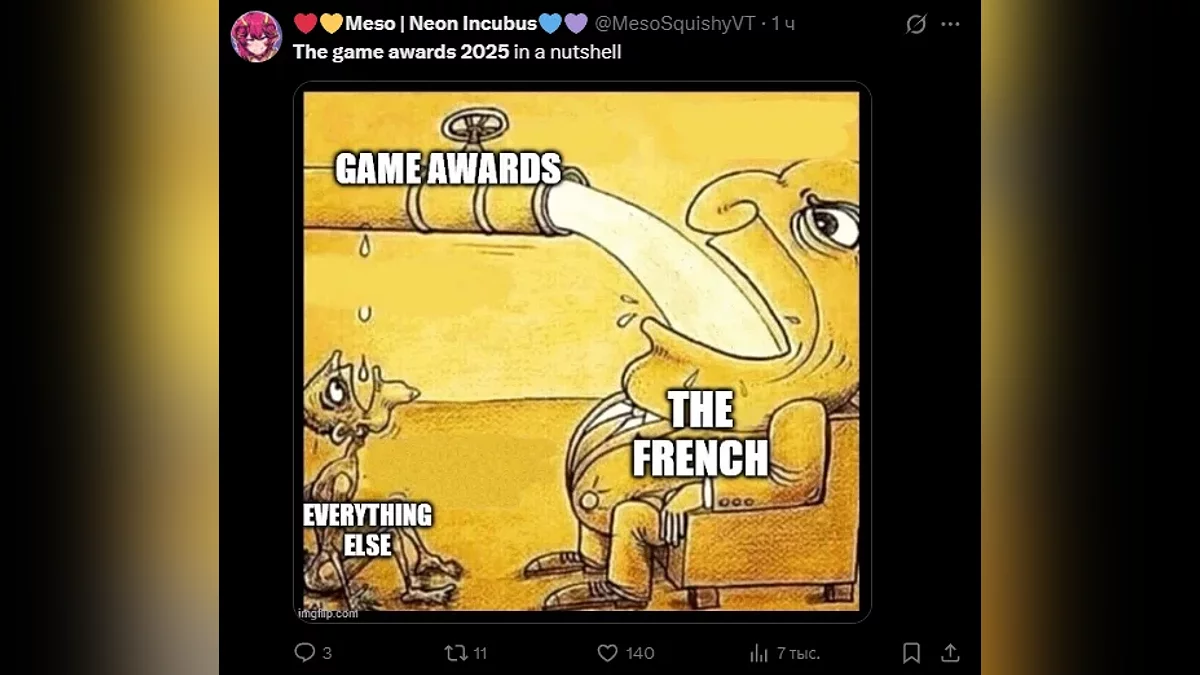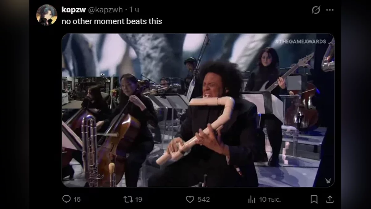 К слову, официальный аккаунт The Game Awards поинтересовался у подписчиков, какой момент церемонии стал самым интересным. Одни вспомнили флейтиста из оркестра, который сыграл на ПВХ-трубе, другие — лёгкое разочарование на лице Хидео Кодзимы (Hideo Kojima), когда Clair Obscur получила награду за «Лучший сценарий».