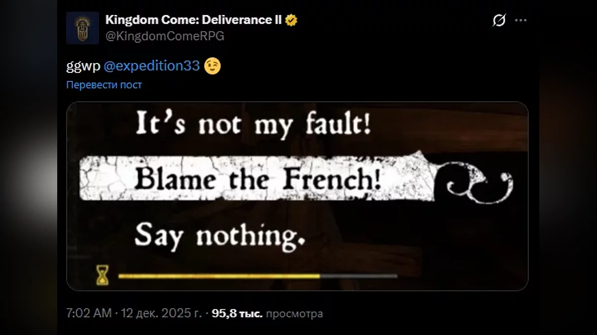 Последнее особенно удивило многих игроков. Warhorse Studios и сама иронично отреагировала на ситуацию, в которой угодила под паровой каток Clair Obscur: Expedition 33. Разработчики KCD 2 не только поздравили Sandfall Interactive лаконичным «gg wp» («Good Game, Well Played» / «Хорошая игра, отлично сыграно»), но и призвала поклонников своей RPG «быть вежливыми» и не устраивать хаос в комментариях из-за упущенной награды.