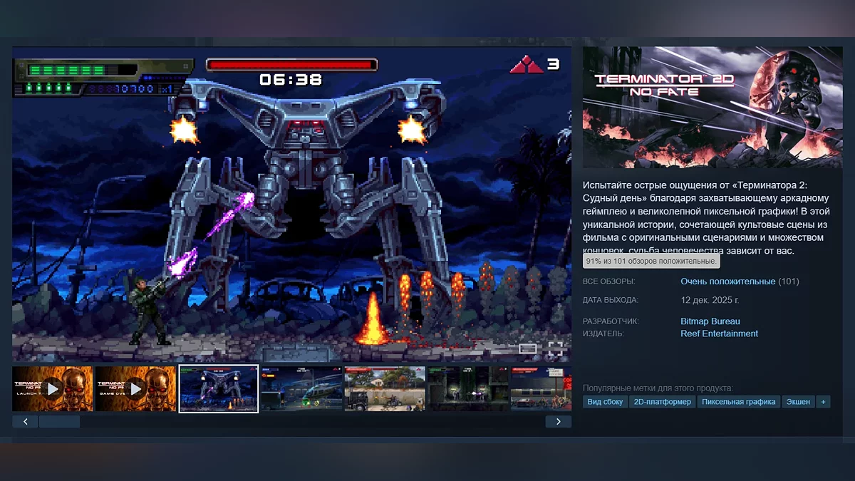 Совсем недавно состоялся релиз ретро-экшена с элементами платформера Terminator 2D: No Fate, который уже успел получить первые отзывы от геймеров в Steam. На момент написания новости рейтинг проекта составляет 91%.