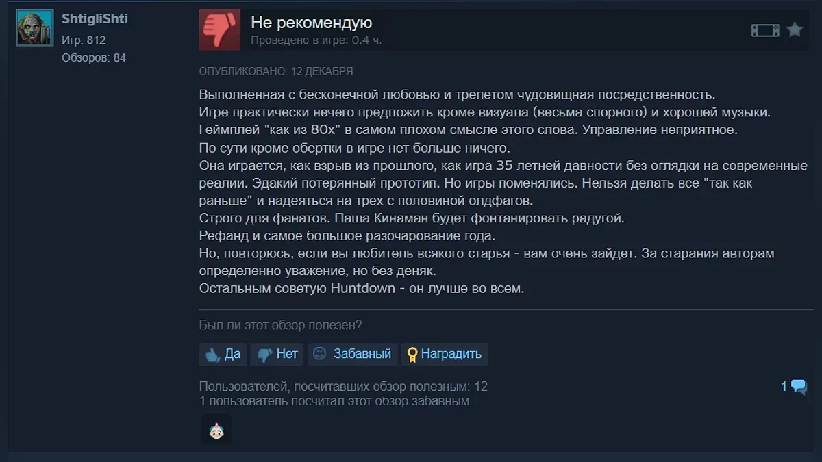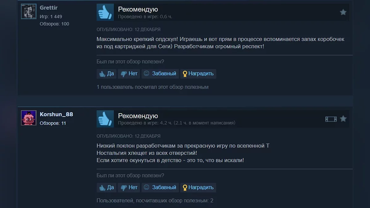К плюсам относят «ламповый» геймплей, дающий нотку ностальгии по 90-м, а к минусам малую продолжительность.