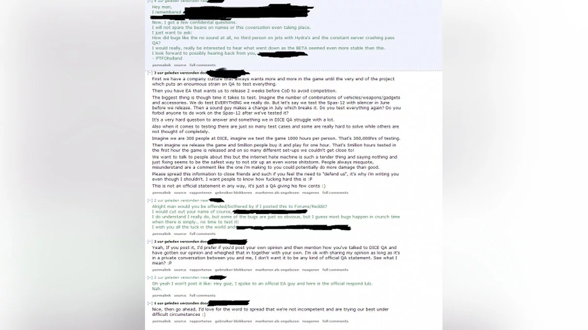 По его словам, ЕА решила попросту опустить все эти ненужные тонкости с исправлением ошибок и прочего, а потребовала выпустить игру раньше Call of Duty: Ghosts. А это для разработчиков значило нехватку времени, чтобы закончить тестирование игры и исправление возможных ошибок.
