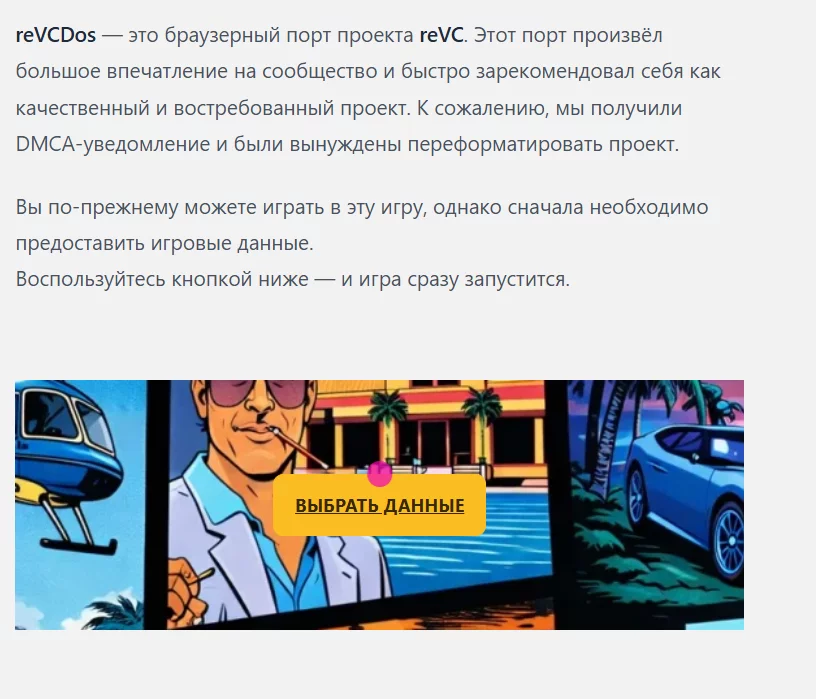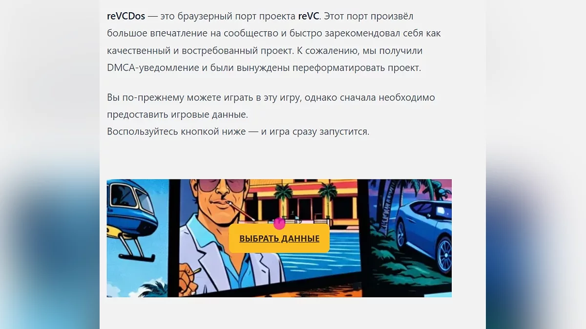 Теперь браузерная Vice City больше не подгружает контент Rockstar с серверов DOS.Zone: пользователю нужно самостоятельно указать оригинальные файлы игры (через специальную кнопку) и только после этого запускать её в окне браузера на PC или мобильном устройстве. По сути, сайт превратился в удобную оболочку и технологический порт движка, а не в источник пиратской копии.