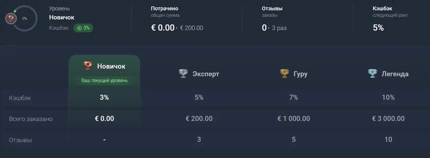 За каждое приобретение пользователи получают вознаграждение до 10% от потраченной суммы. Уровень кешбэка зависит от ранга на платформе — чем больше покупок и активности, тем он выше.