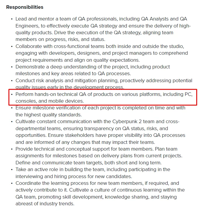 Речь идёт о роли старшего тестировщика для команды Cyberpunk 2, который должен курировать стратегию тестирования, управлять аналитиками и инженерами QA, проводить анализ рисков и следить за качеством сборок на всех заявленных платформах. Среди требований — как минимум пять лет опыта в техническом QA, знание игровых движков вроде Unreal, Unity, Godot и REDkit, а также умение выстраивать комплексные стратегии тестирования производительности и сетевых функций.