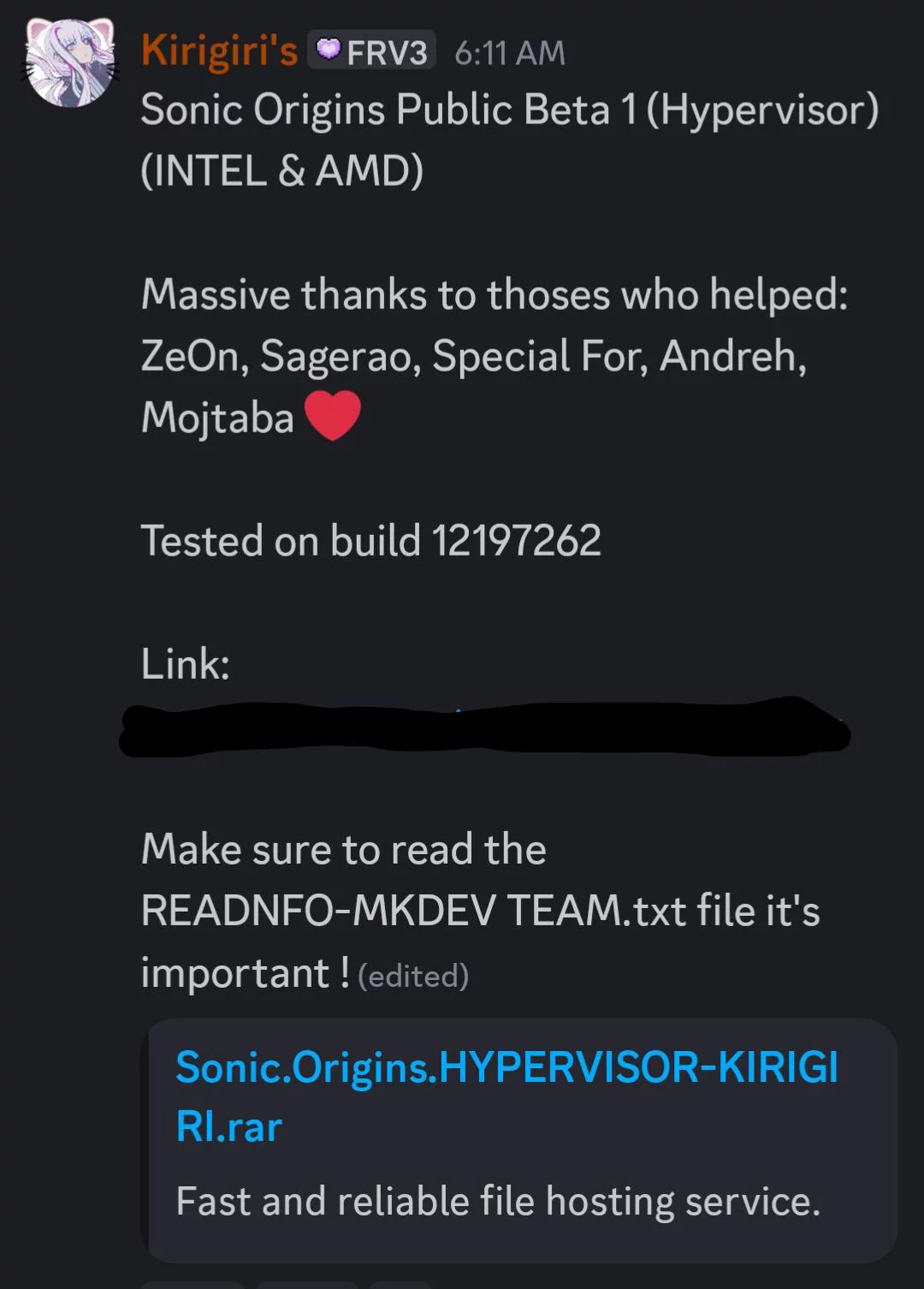 Пираты взломали защиту Sonic Origins с помощью гипервизора — но ценой серьёзных рисков для безопасности системы. Энтузиаст под ником KiriGiri выложил в сеть публичную «бету» обхода Denuvo для Sonic Origins, рассчитанную на процессоры Intel и AMD и использующую собственный драйвер на уровне ядра.