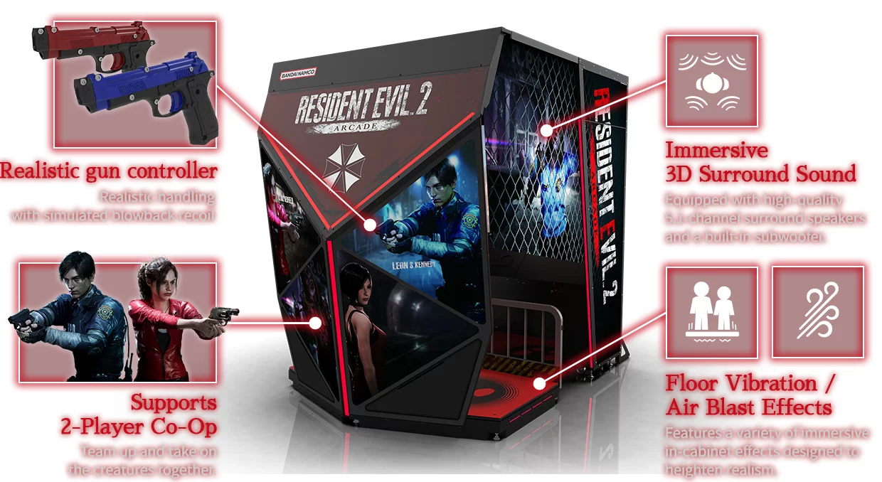Сообщается, что аркадные автоматы с Resident Evil 2 Arcade будут оснащены контроллерами-пистолетами с продвинутой тактильной отдачей, виброполом и системой распыления тумана.