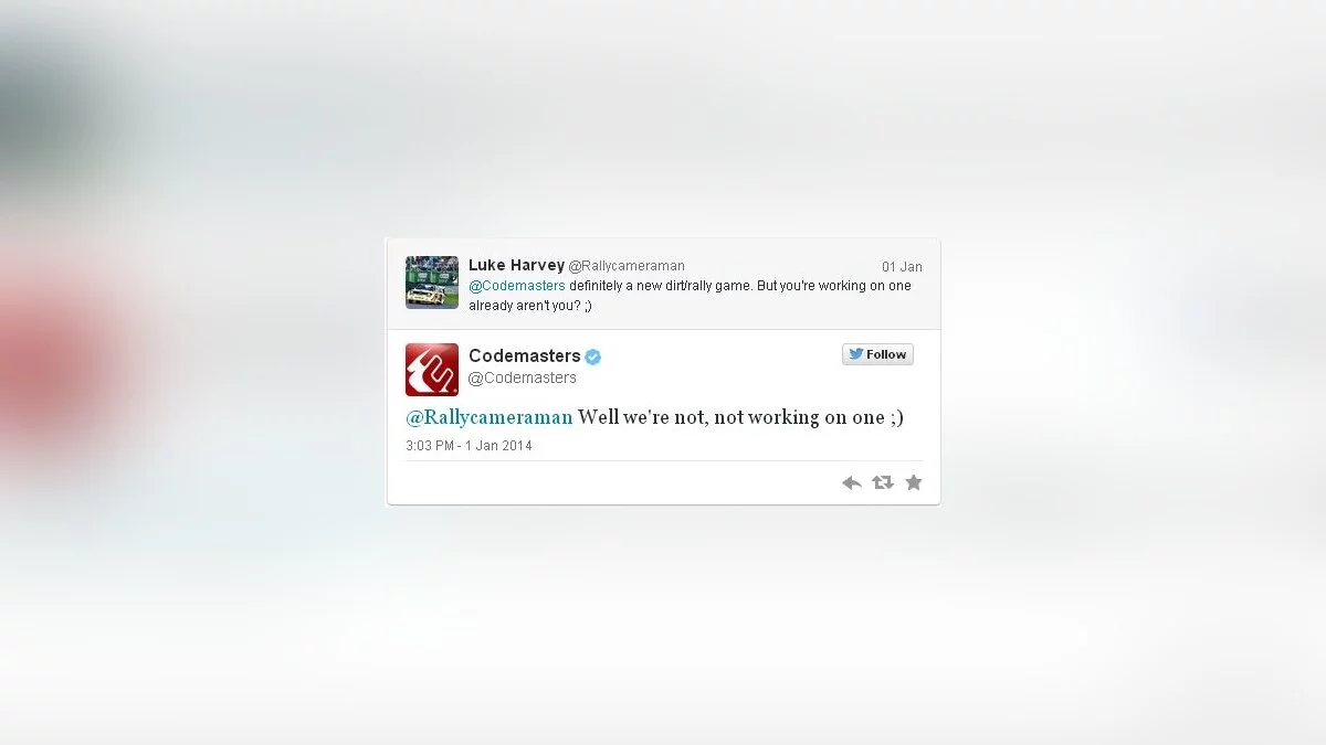 Все это мы смогли узнать из Twitter. Разработчики задали своим фанатам вопрос о том, что бы они хотели видеть в наступившем 2014 году. Один из пользователей выказал надежду на новую Dirt, и не упустил шанса спросить работают ли над ней прямо сейчас. На что Codemasters ответили, что не только над ней.