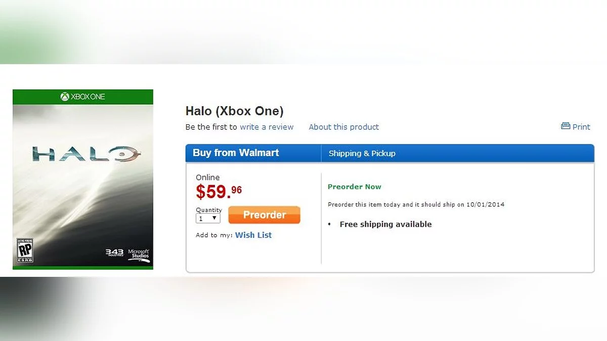 На сайте американской сети магазинов WalMart появилась страничка Halo (Xbox One). На ней есть и цена игры, и дата выхода, и постер. Возможно, страница создана просто заранее с примерной датой.