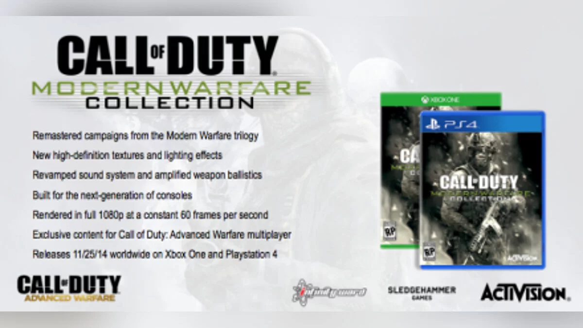 Call of Duty: Modern Warfare Collection — это переиздание одного из самых известных шутеров от первого лица, созданного студией Infinity Ward. 4 ноября этого года выйдет ещё одна часть серии. Call of Duty: Advenced Warfare разрабатывается уже другой студией — Sledgehammer Games.