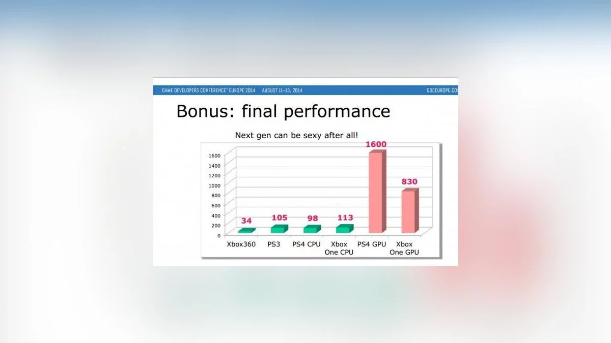 Интересные данные появились в сети с августовского доклада сотрудников Ubisoft на Gamescom 2014. Внутреннее тестирование компании установило двукратное превосходство графической составляющей PS4 над Xbox One.