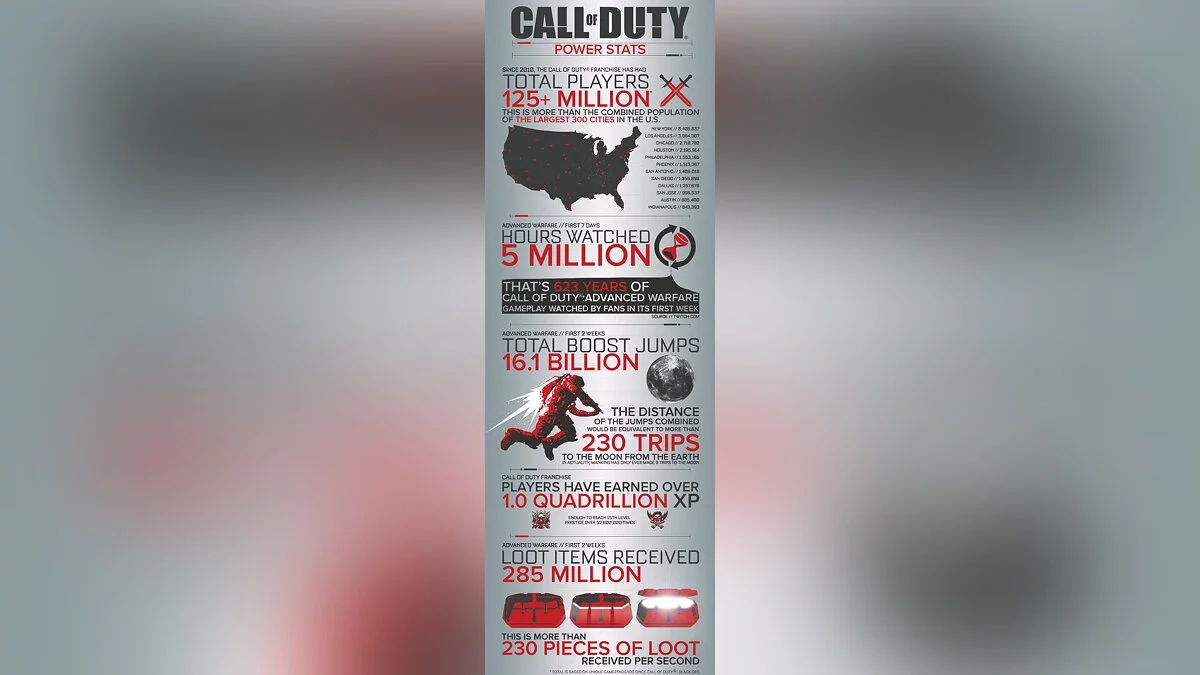 Компания Activision поделилась впечатляющей статистикой франшизы Call of Duty за последние 5 лет. Число игроков, официально купивших игру, превысило 125 000 000 человек.