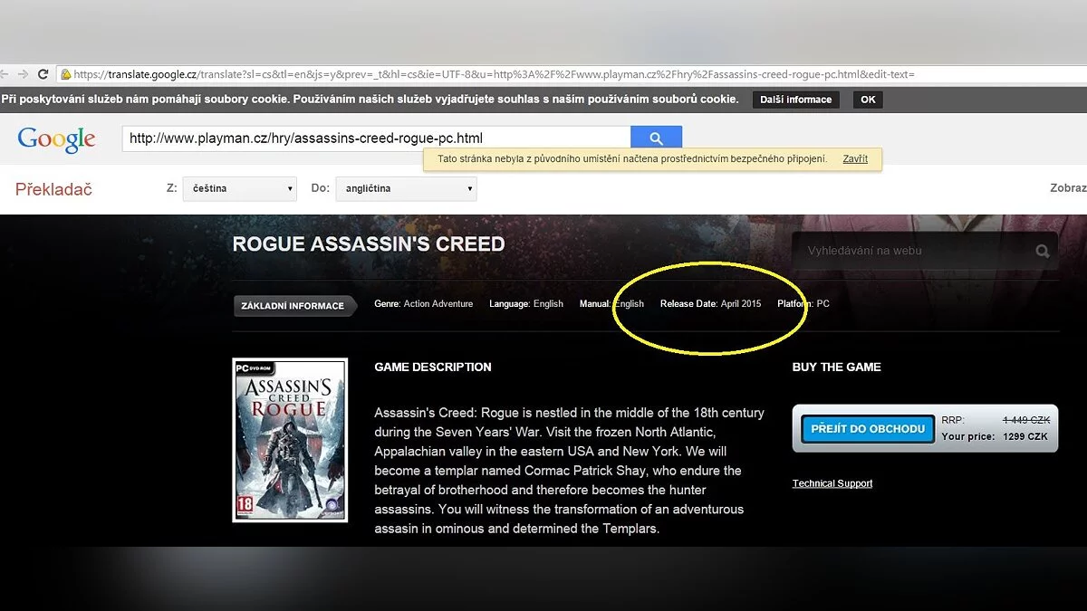 Источником для слуха стал чешский интернет-магазин компьютерных игр Playman. Его сотрудники недавно обновили страницу Assassin's Creed: Rogue, указав дату выхода — апрель 2015 года. Разумеется, относиться к этой дате стоит с некоторым подозрением — кто знает, когда Ubisoft действительно выпустит данную игру.