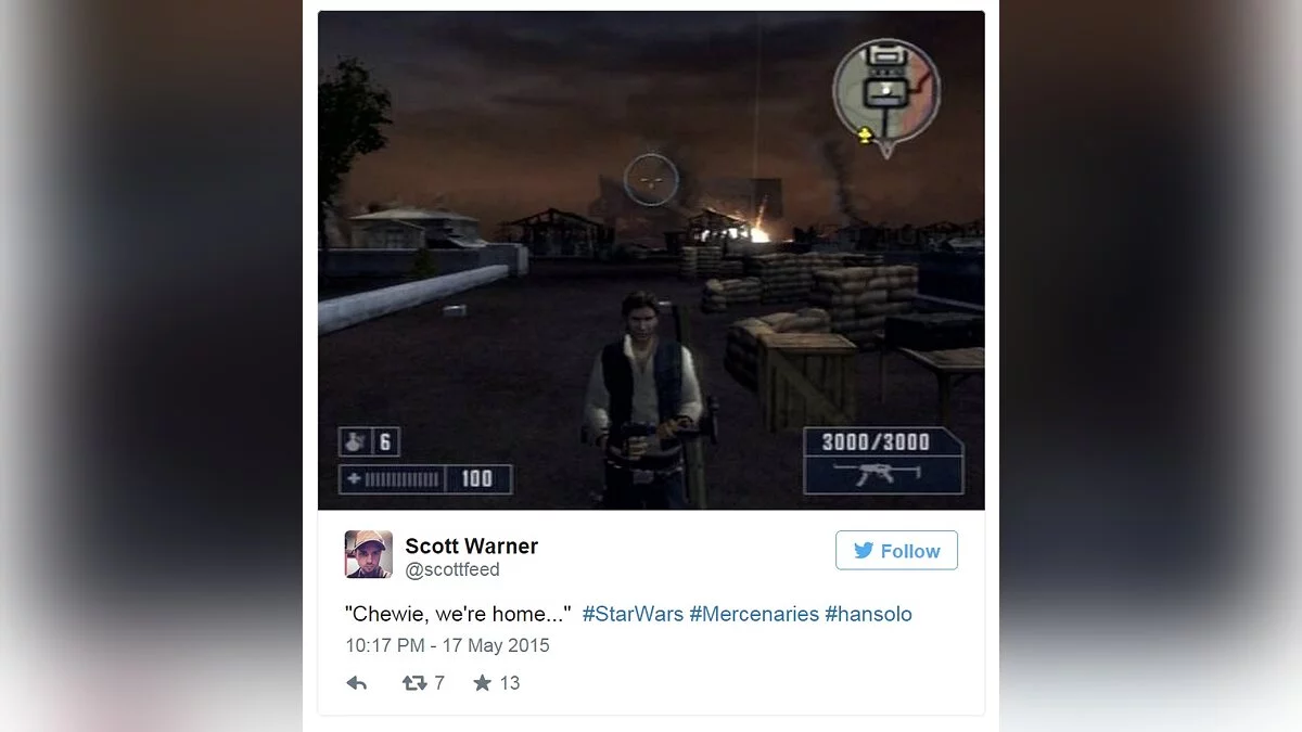 «Мы все еще гордимся тем, чего добились в Mercenaries... песочница, гибкий AI, форпосты и все это в открытом мире», — написал Уорнер. — «Чуи, мы дома... #StarWars #Mercenaries #hansolo».