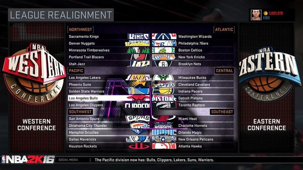 На следующем примере показано, как команда «Чикаго Буллс» переезжает в Лос-Анджелес и оказываются в одном дивизионе с «Лейкерс» и «Клипперс». Кроме того, у вас будет возможность изменить логотип, арену, а также комплекты формы.