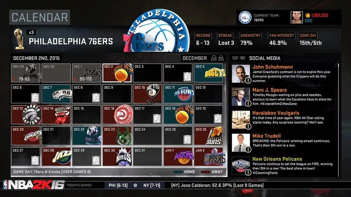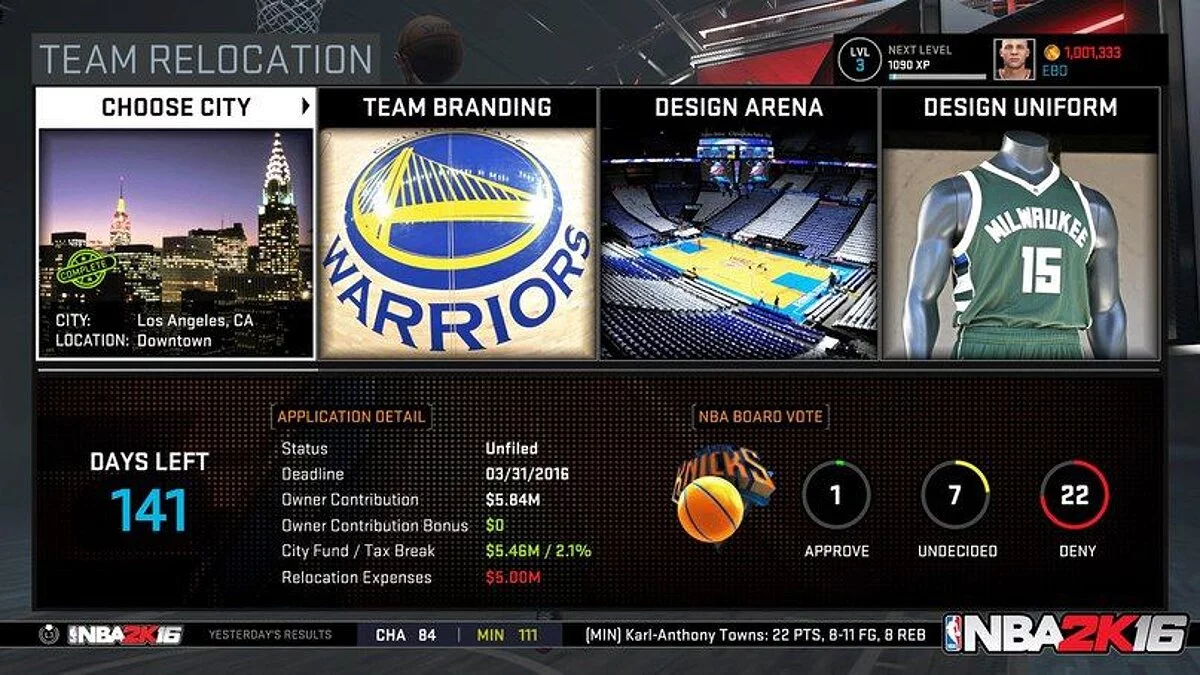 Эрик Бениш (Erick Boenisch), старший продюсер серии NBA 2K, сказал, что очередным нововведением карьеры NBA 2K16 станет возможность переезда вашей команды в другой город. Если Лига даст соглашение на переезд, вы сможете выбрать арену в другом городе. Решение об этом принимается раз в год, 31 марта.