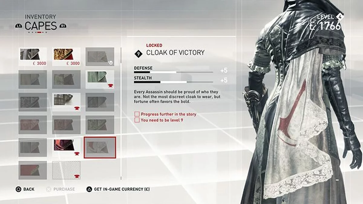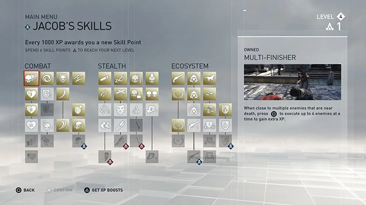 Кастомизация героев будет похожа на ту, что была в Unity, но немного продуманней. Так, игрокам будут доступны три ветки развития: стелс, бой и экосистема. Благодаря навыкам вы сможете увеличивать запас здоровья, продолжать действие определенного умения и так далее. У двух героев, Джейкоба и Иви Фрай, ветки навыков будут разными. Магазин игровых предметов тоже богат на разнообразность. Капюшоны, оружие, сапоги, готовые костюмы — подобного здесь навалом.