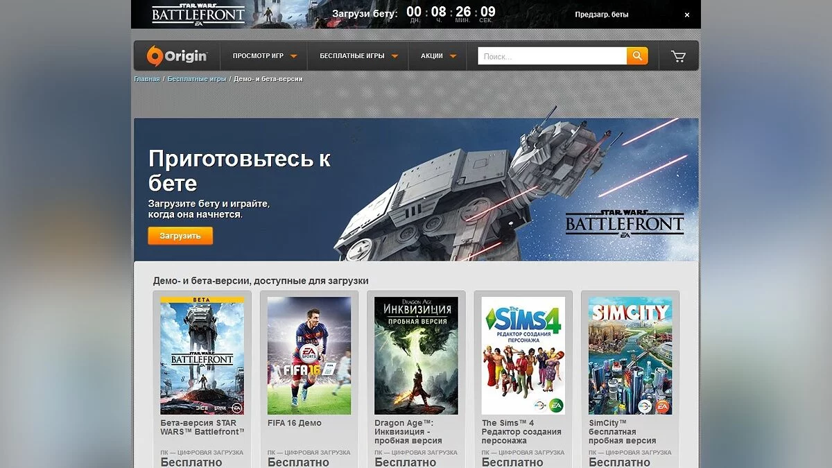 Для того чтобы скачать бету, необходимо зайти на страницу «Магазин» клиента цифровой дистрибуции Origin и посмотреть либо вверх, либо в центр: