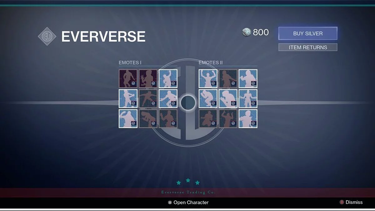 «Серебро» можно купить как через PSN, так и через Xbox Store, а потратить валюту можно на приобретение новых типов эмоций в новом внутриигровом магазине Eververse Trading Company. Среди этих эмоций числятся танцы и целый ряд веселых празднований. На старте Bungie дала немного «Серебра» всем игрокам, чтобы те могли опробовать несколько эмоций.