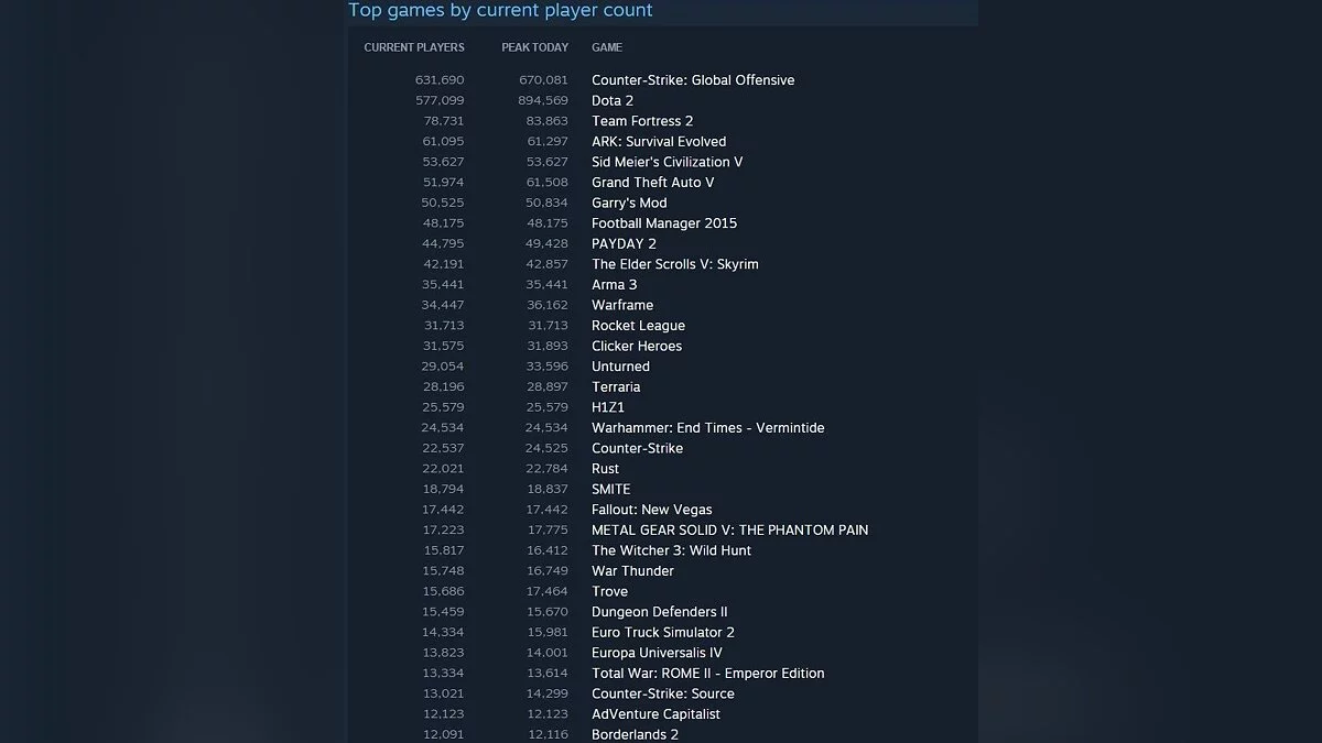 В числе самых популярных игр были, разумеется, Counter-Strike: Global Offensive и DOTA 2 — они разделили 1 и 2 место, но борьба между ними намного жестче — DOTA 2 пока что лидирует по пиковому числу игроков онлайн.