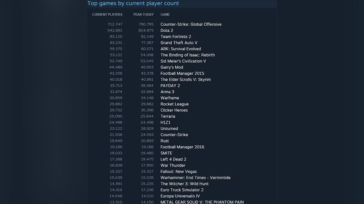 Как и неделю назад, в числе самых популярных игр были, разумеется, Counter-Strike: Global Offensive и DOTA 2 — они разделили 1 и 2 место, но борьба между ними намного жестче — DOTA 2 пока что лидирует по пиковому числу игроков онлайн.