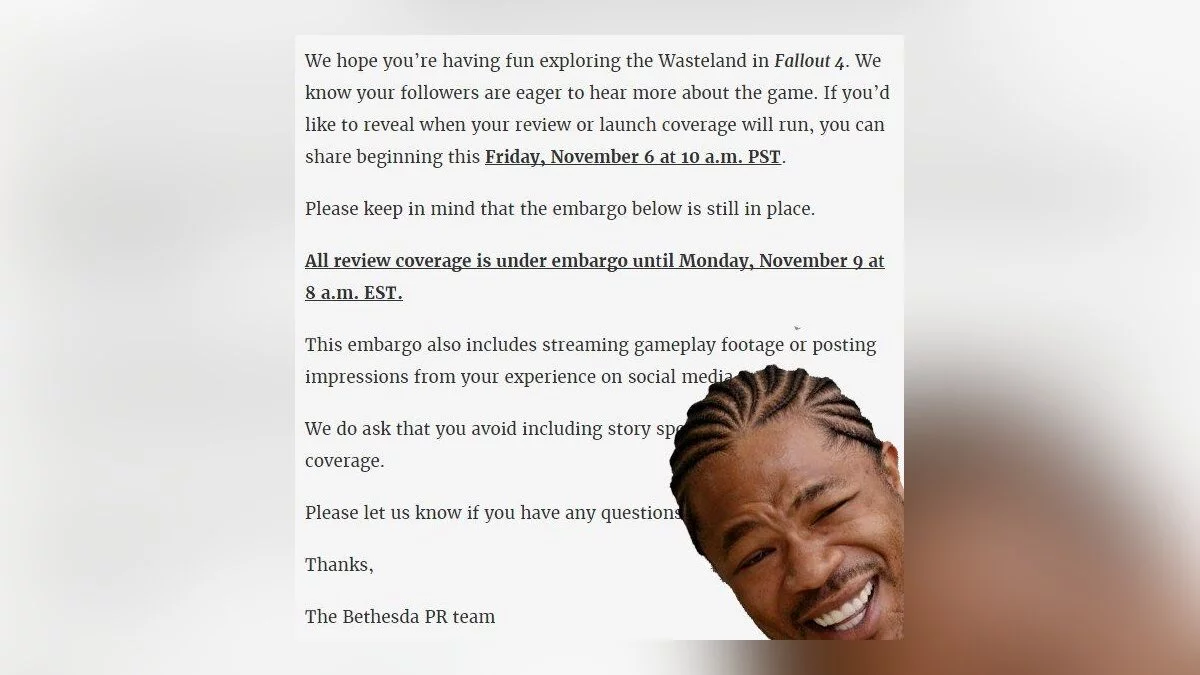 Многие издатели делают эмбарго — запрет на публикацию рецензий до конкретного числа. Но ещё никто не придумал эмбарго на эмбарго — как это сделала Bethesda с Fallout 4.