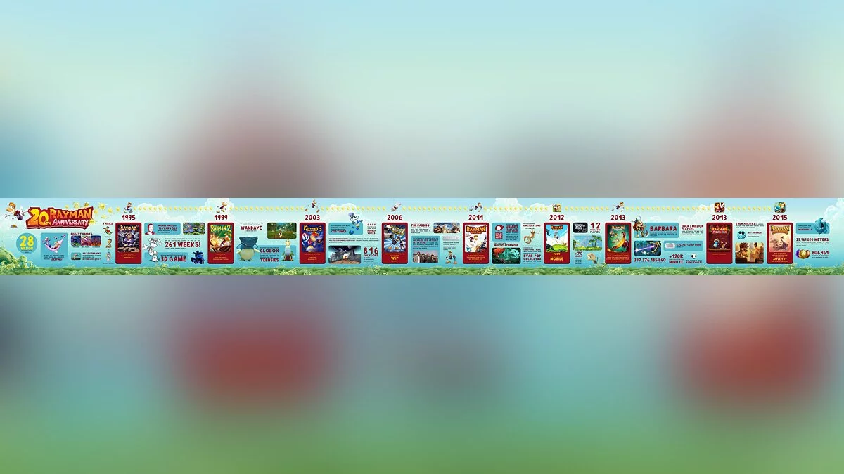 Французская корпорация поделилась картинкой, демонстрирующей различные факты по вселенной Rayman на протяжении вышедших игр. Из неё можно узнать, что серия превысила порог в 28 млн. проданных копий, Мишель Ансель начал карьеру разработчика в 16 лет и первоначально хотел сделать Рэймана трёхмерным, а персонажи во второй части общаются на языке вэндайей.