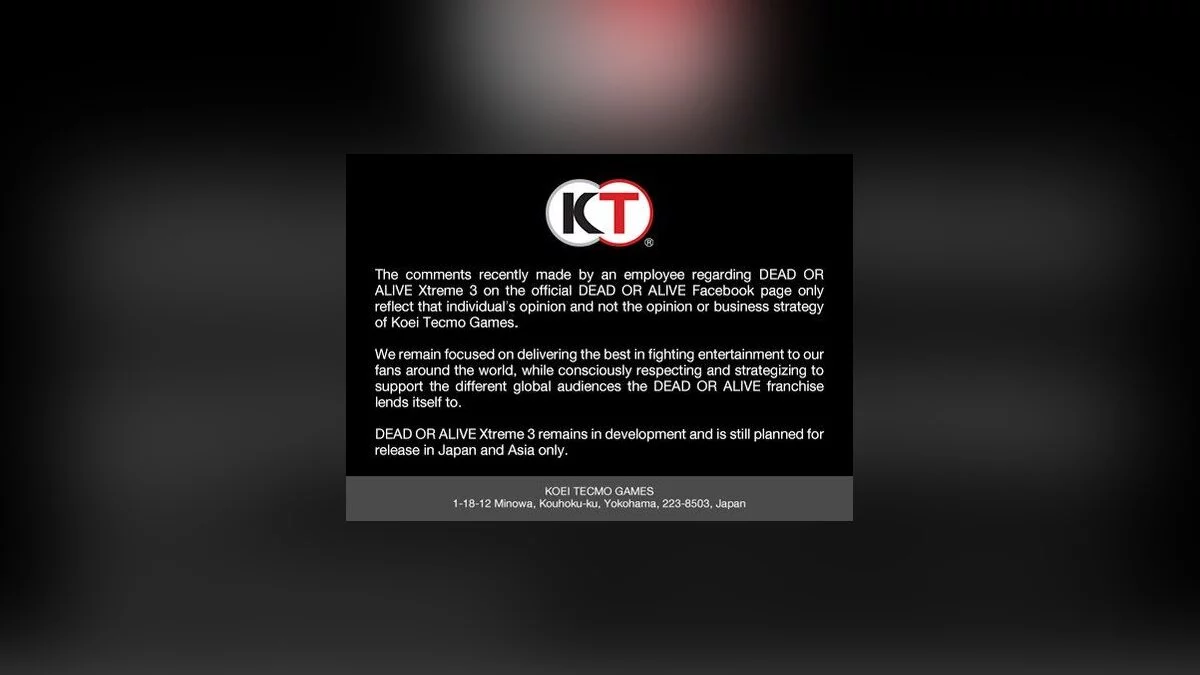 В заявлении говорится о том, что сообщение на фейсбуке было всего лишь «мнением одного из сотрудников», и не отражает официальную позицию Koei Tecmo. Тем не менее, отразить ее компания в своем заявлении отказалась, а Dead or Alive Xtreme 3 все еще выходит только в Японии и Азии.