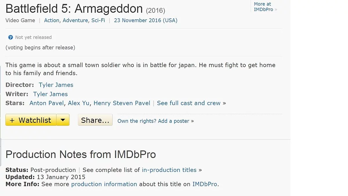Об этом говорит IMDB-страница проекта, которая составлена достаточно подробно. Итак, Battlefield 5: Armageddon — это видеоигра, которая выйдет 23 ноября 2016 года и сейчас над ней работает DICE. Сценарием и руководством над разработкой однопользовательского режима занимается Тайлер Джеймс (Tyler James).
