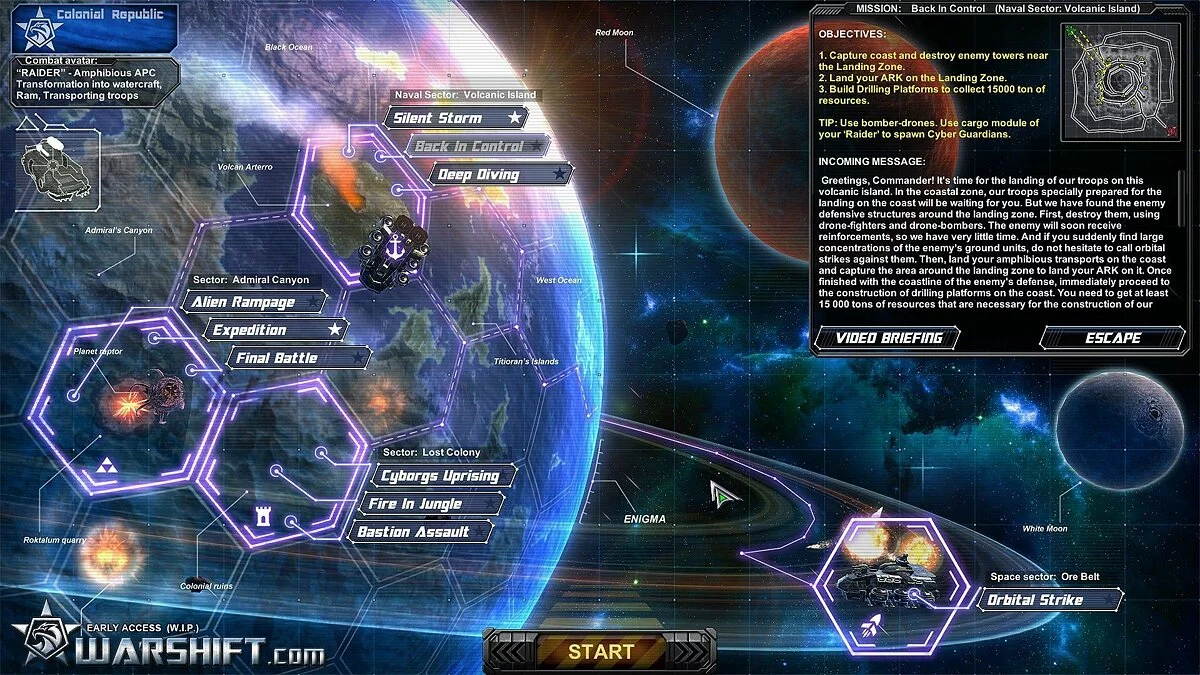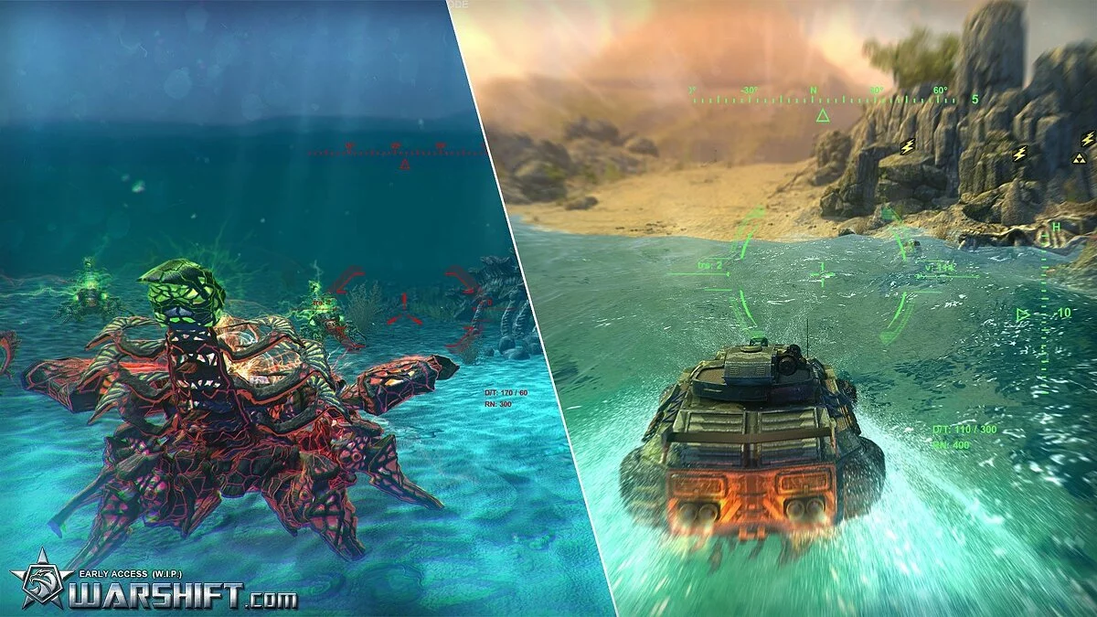 Действие Warshift разворачивается в четырех секторах — космическом Ore Belt, разработанном специально для околопланетарных боев, подводном Volcanic Island, на передовой Frontier, и в дикой природе Admiral’s Canyon.