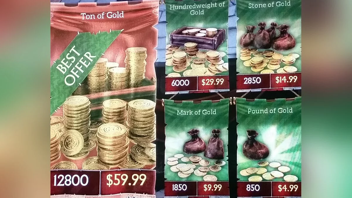 Пусть тестирование и закрытое, но это не помешало нескольким скриншотам внутриигрового магазина попасть в сеть. В нем предлагают несколько вариантов покупки мешка золота различной степени тяжести: от 4.99 $ до 59.99 $. Последний набор называется не иначе, как «тонна золота», и по он цене сопоставим с полноценной игрой.
