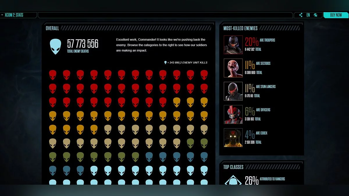 На официальном сайте XCOM есть специальная страничка, посвященная статистике геймеров XCOM 2. На ней можно найти информацию о том, сколько всего и каких именно пришельцев было уничтожено, какое количество солдат пало в бою и т.д. Как выясняется, игроки уже успели уничтожить около 50-ти миллионов инопланетян, и это только начало.