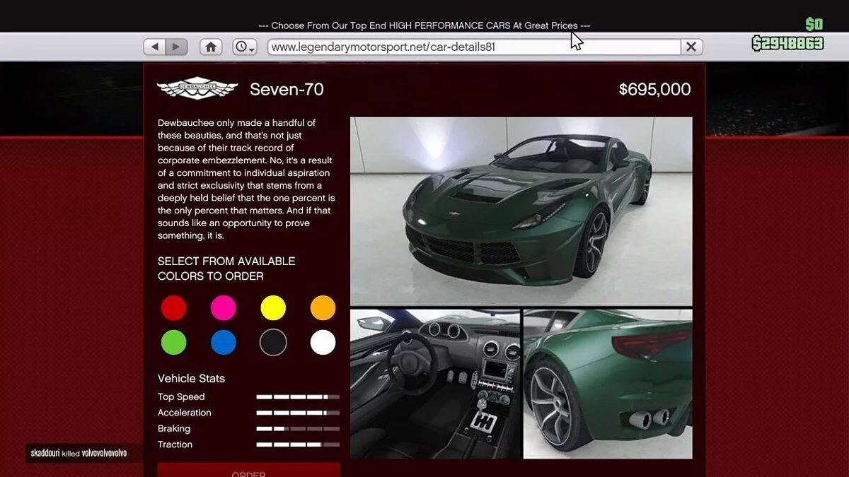 Dewbauche Seven-70 является последним автомобилем, добавленным в игру в рамках обновления «Новые приключения бандитов и мошенников» (Further Adventures in Finance and Felony). На скриншоте ниже можете ознакомиться с его характеристиками: